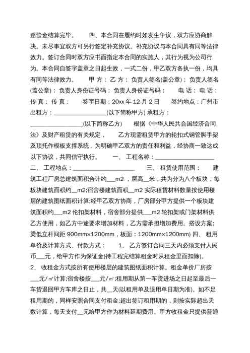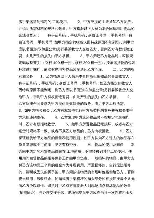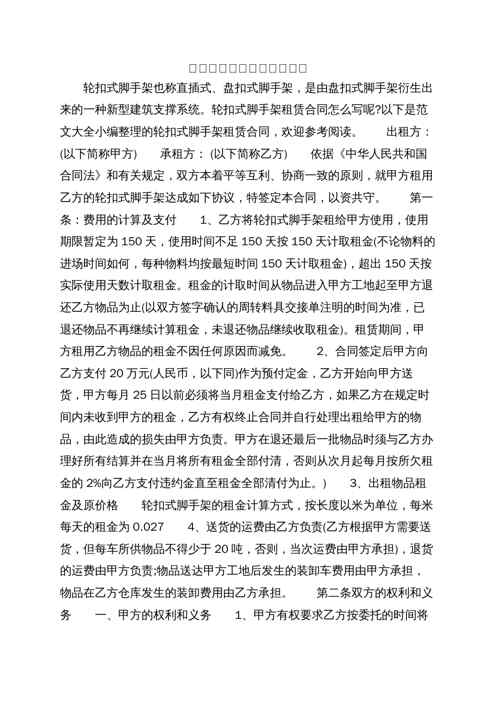 本站正式发布了《轮扣式脚手架租赁合同样本》文档,文档详细内容可下载阅读。 声明:本站所有文章,如无特殊说明或标注,均为本站原创发布。任何个人或组织,在未征得本站同意时,禁止复制、盗用、采集、发布本站内容到任何网站、书籍等各类媒体平台。如若本站内容侵犯了原著者的合法权益,可联系我们进行处理。