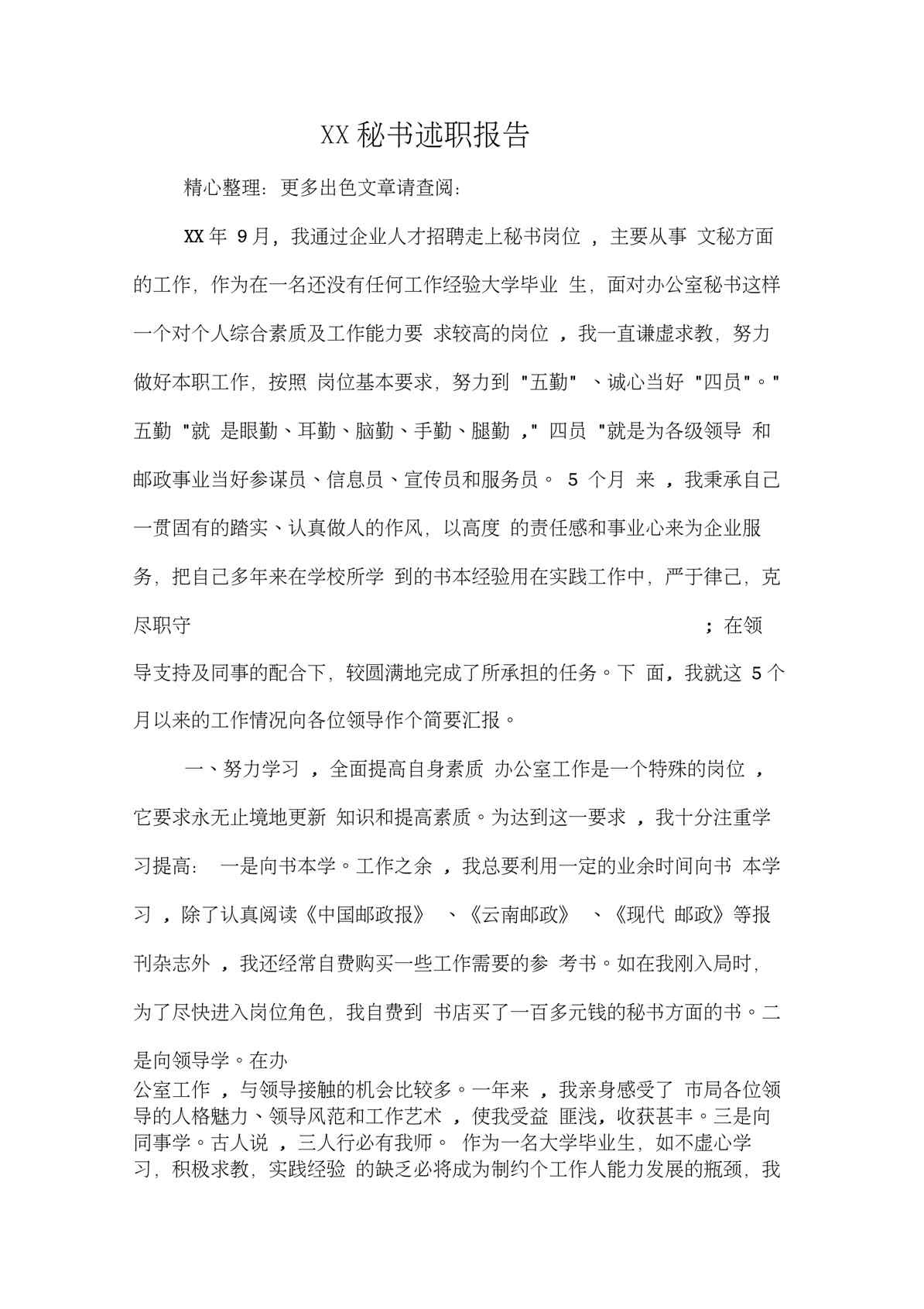 不久前,最新文档《XX秘书述职报告》全文正式在本站发布,感兴趣的用户可以下载阅读。 声明:本站所有文章,如无特殊说明或标注,均为本站原创发布。任何个人或组织,在未征得本站同意时,禁止复制、盗用、采集、发布本站内容到任何网站、书籍等各类媒体平台。如若本站内容侵犯了原著者的合法权益,可联系我们进行处理。