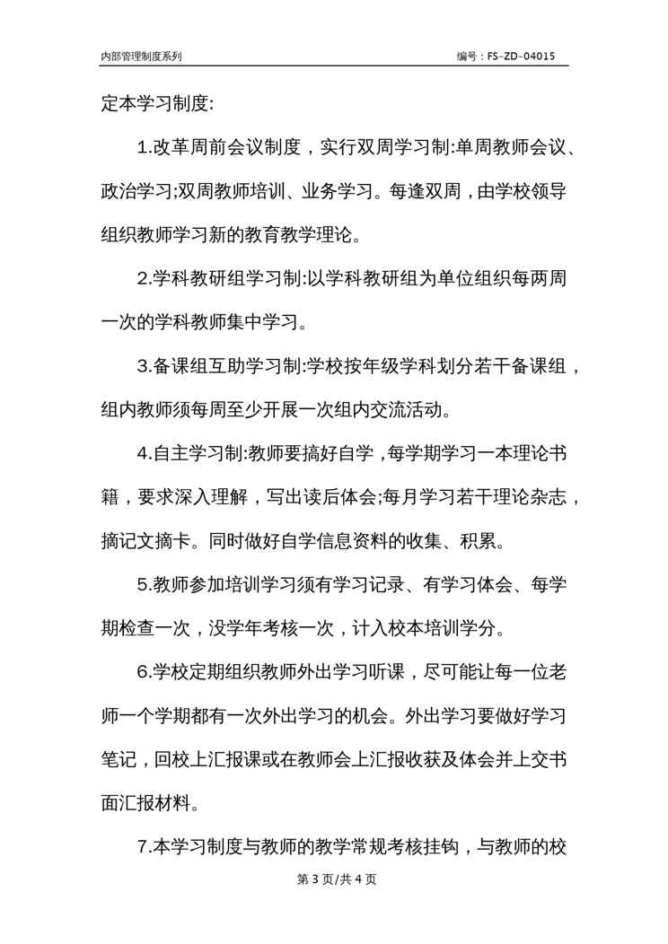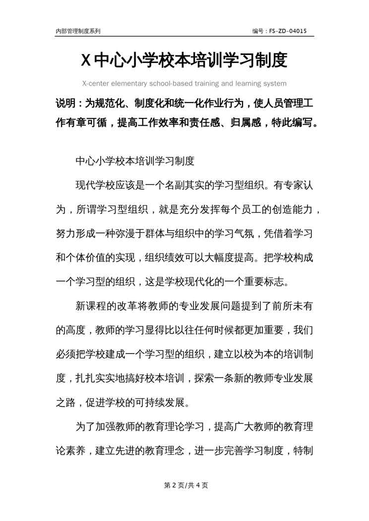本站资深用户发布了最新的《X中心小学校本培训学习管理制度范本》文档,以下内容为预览,详细内容可下载阅读。 声明:本站所有文章,如无特殊说明或标注,均为本站原创发布。任何个人或组织,在未征得本站同意时,禁止复制、盗用、采集、发布本站内容到任何网站、书籍等各类媒体平台。如若本站内容侵犯了原著者的合法权益,可联系我们进行处理。