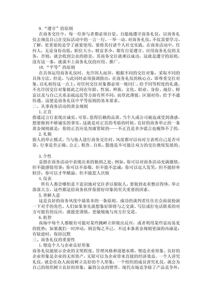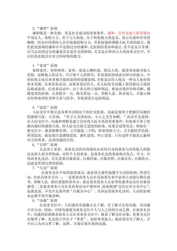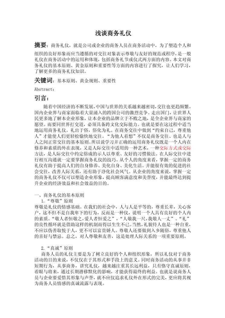 本站资深用户发布了最新的《浅谈商务礼仪》文档,以下内容为预览,详细内容可下载阅读。 声明:本站所有文章,如无特殊说明或标注,均为本站原创发布。任何个人或组织,在未征得本站同意时,禁止复制、盗用、采集、发布本站内容到任何网站、书籍等各类媒体平台。如若本站内容侵犯了原著者的合法权益,可联系我们进行处理。