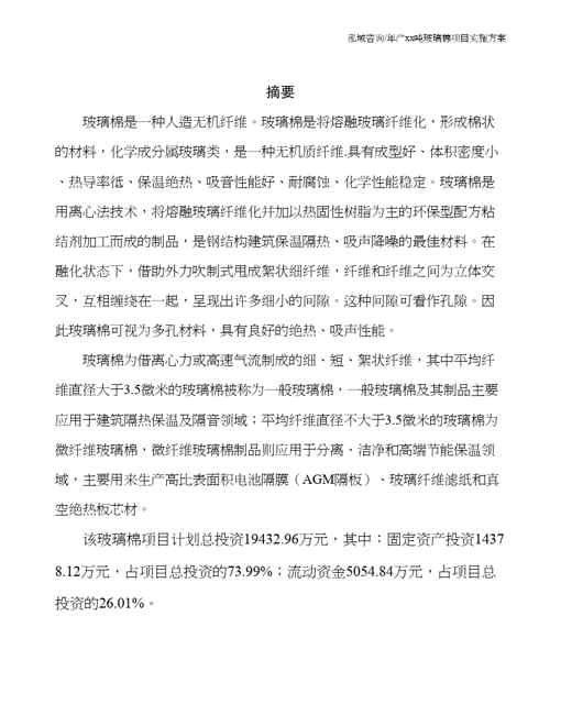 本站正式发布了《年产xx吨玻璃棉项目实施方案模板》文档,文档详细内容可下载阅读。 声明:本站所有文章,如无特殊说明或标注,均为本站原创发布。任何个人或组织,在未征得本站同意时,禁止复制、盗用、采集、发布本站内容到任何网站、书籍等各类媒体平台。如若本站内容侵犯了原著者的合法权益,可联系我们进行处理。