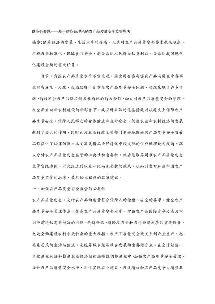 本站正式发布了《(scm供应链管理)供应链专题——基于供应链理论的农产品质量安全监管思考》文档,文档详细内容可下载阅读。 声明:本站所有文章,如无特殊说明或标注,均为本站原创发布。任何个人或组织,在未征得本站同意时,禁止复制、盗用、采集、发布本站内容到任何网站、书籍等各类媒体平台。如若本站内容侵犯了原著者的合法权益,可联系我们进行处理。