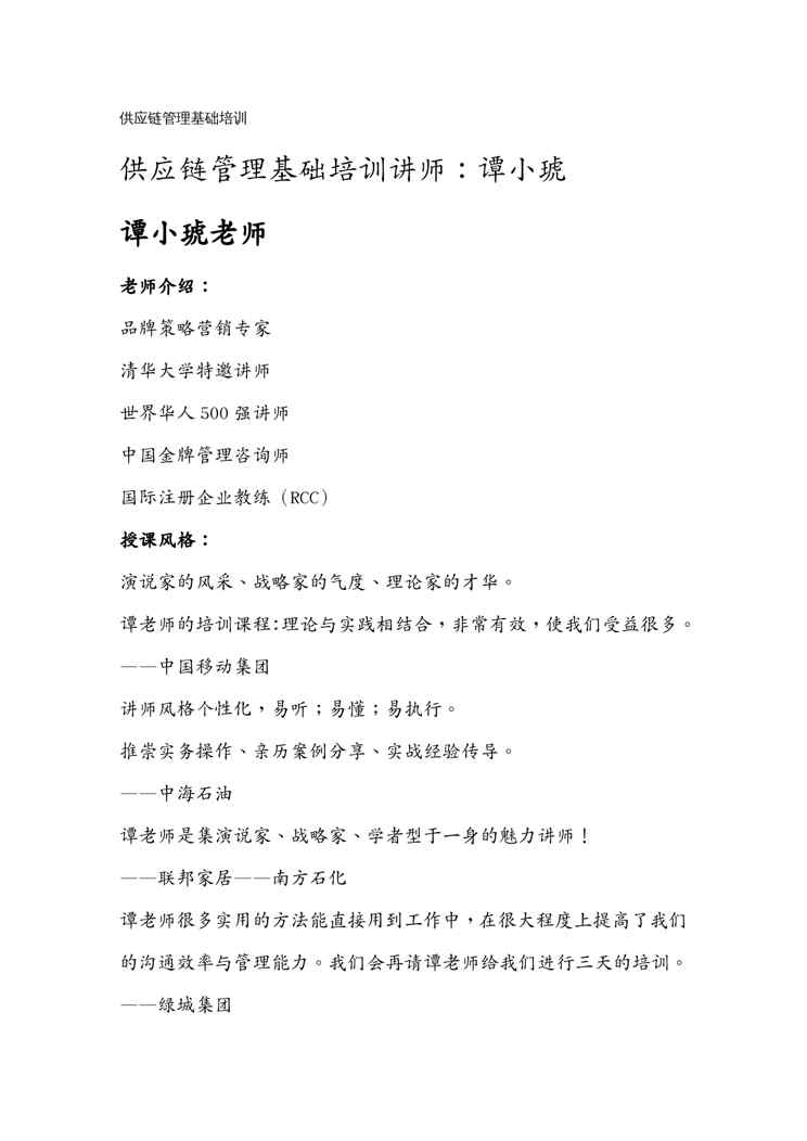 本站资深用户发布了最新的《(scm供应链管理)供应链管理基础培训》文档,以下内容为预览,详细内容可下载阅读。 声明:本站所有文章,如无特殊说明或标注,均为本站原创发布。任何个人或组织,在未征得本站同意时,禁止复制、盗用、采集、发布本站内容到任何网站、书籍等各类媒体平台。如若本站内容侵犯了原著者的合法权益,可联系我们进行处理。