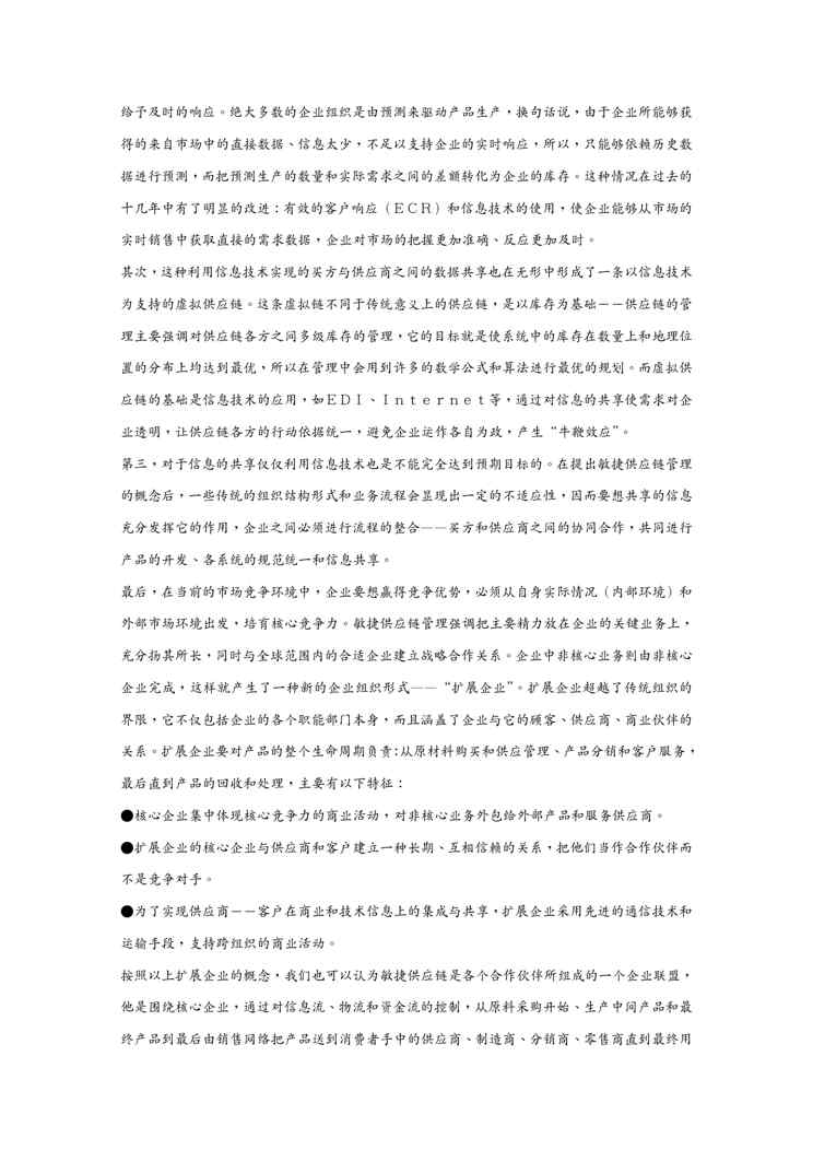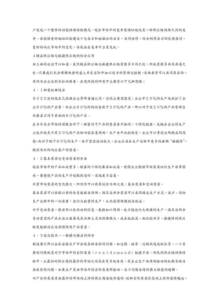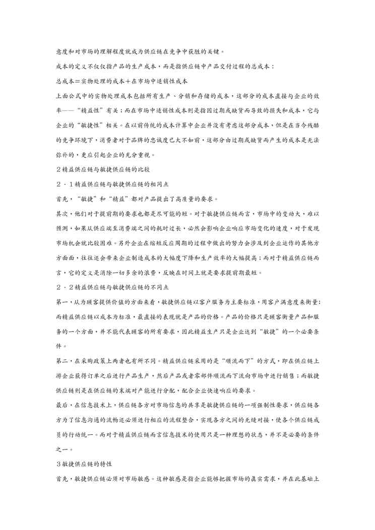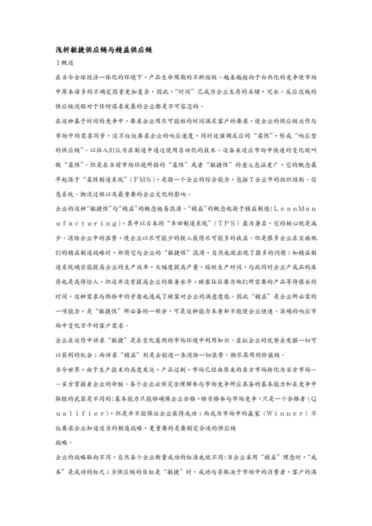 不久前,最新文档《(scm供应链管理)浅析敏捷供应链与精益供应链》全文正式在本站发布,感兴趣的用户可以下载阅读。 声明:本站所有文章,如无特殊说明或标注,均为本站原创发布。任何个人或组织,在未征得本站同意时,禁止复制、盗用、采集、发布本站内容到任何网站、书籍等各类媒体平台。如若本站内容侵犯了原著者的合法权益,可联系我们进行处理。
