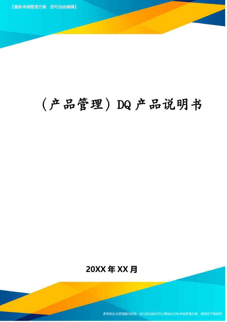 本站资深用户发布了最新的《(产品管理)DQ产品说明书》文档,以下内容为预览,详细内容可下载阅读。 声明:本站所有文章,如无特殊说明或标注,均为本站原创发布。任何个人或组织,在未征得本站同意时,禁止复制、盗用、采集、发布本站内容到任何网站、书籍等各类媒体平台。如若本站内容侵犯了原著者的合法权益,可联系我们进行处理。