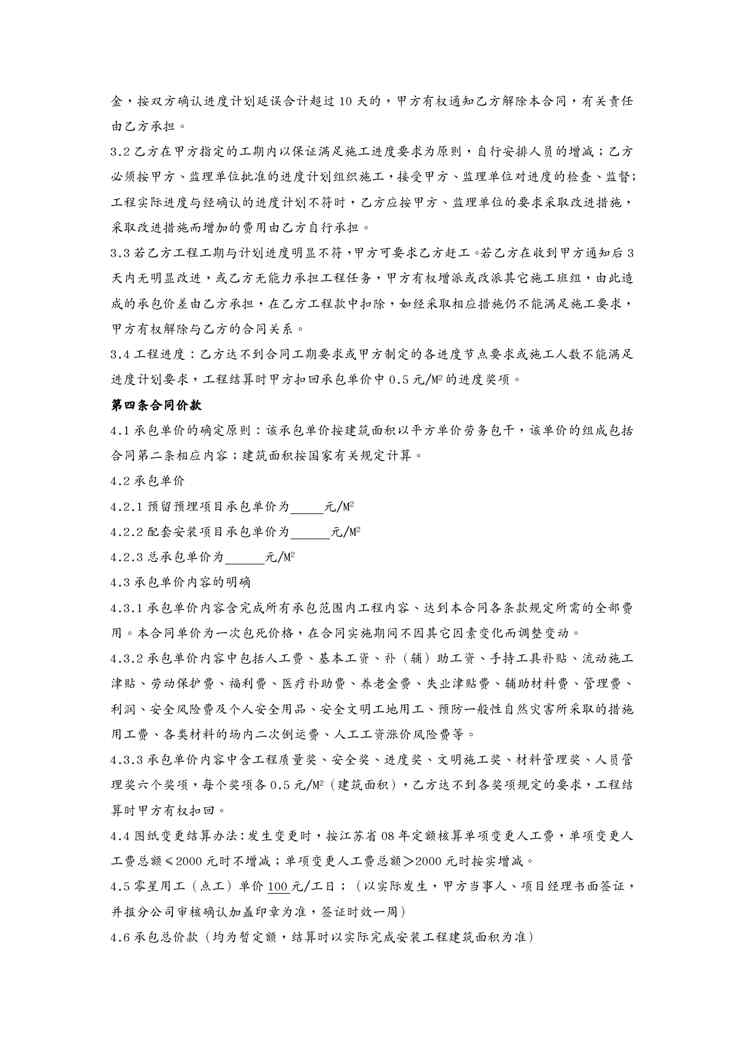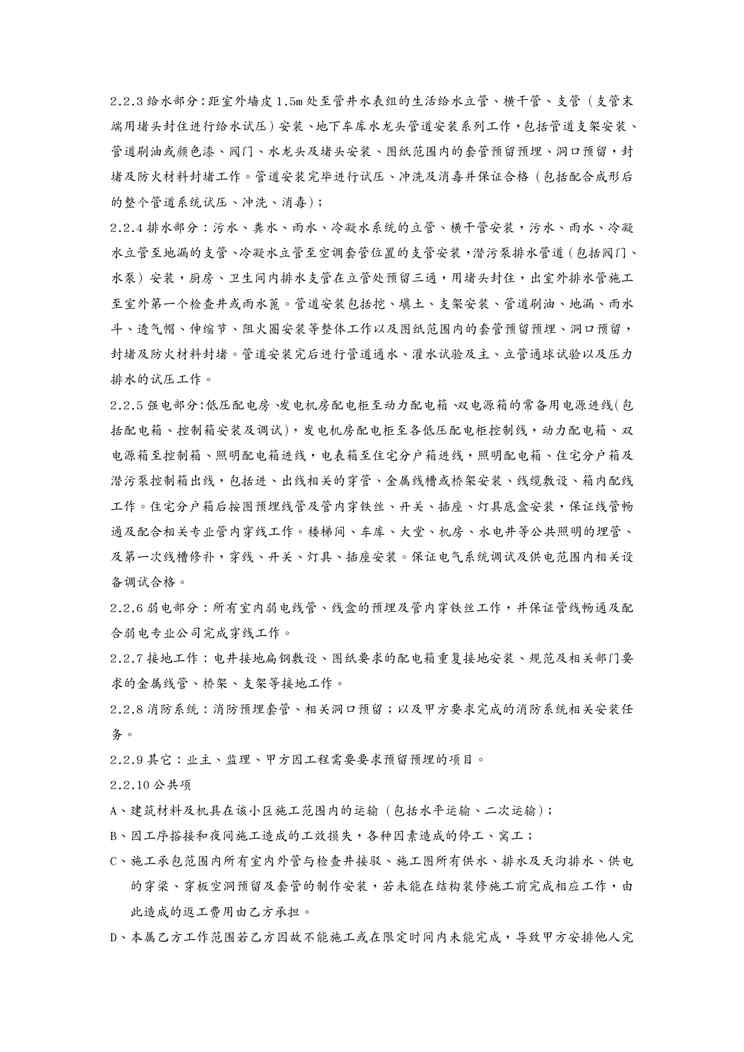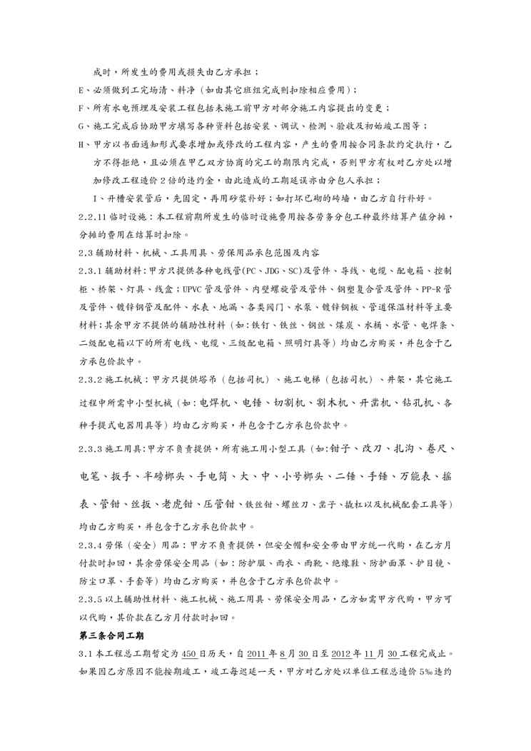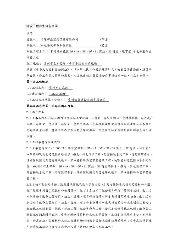 本站资深用户发布了最新的《(合同知识)水电安装劳务分包合同》文档,以下内容为预览,详细内容可下载阅读。 声明:本站所有文章,如无特殊说明或标注,均为本站原创发布。任何个人或组织,在未征得本站同意时,禁止复制、盗用、采集、发布本站内容到任何网站、书籍等各类媒体平台。如若本站内容侵犯了原著者的合法权益,可联系我们进行处理。