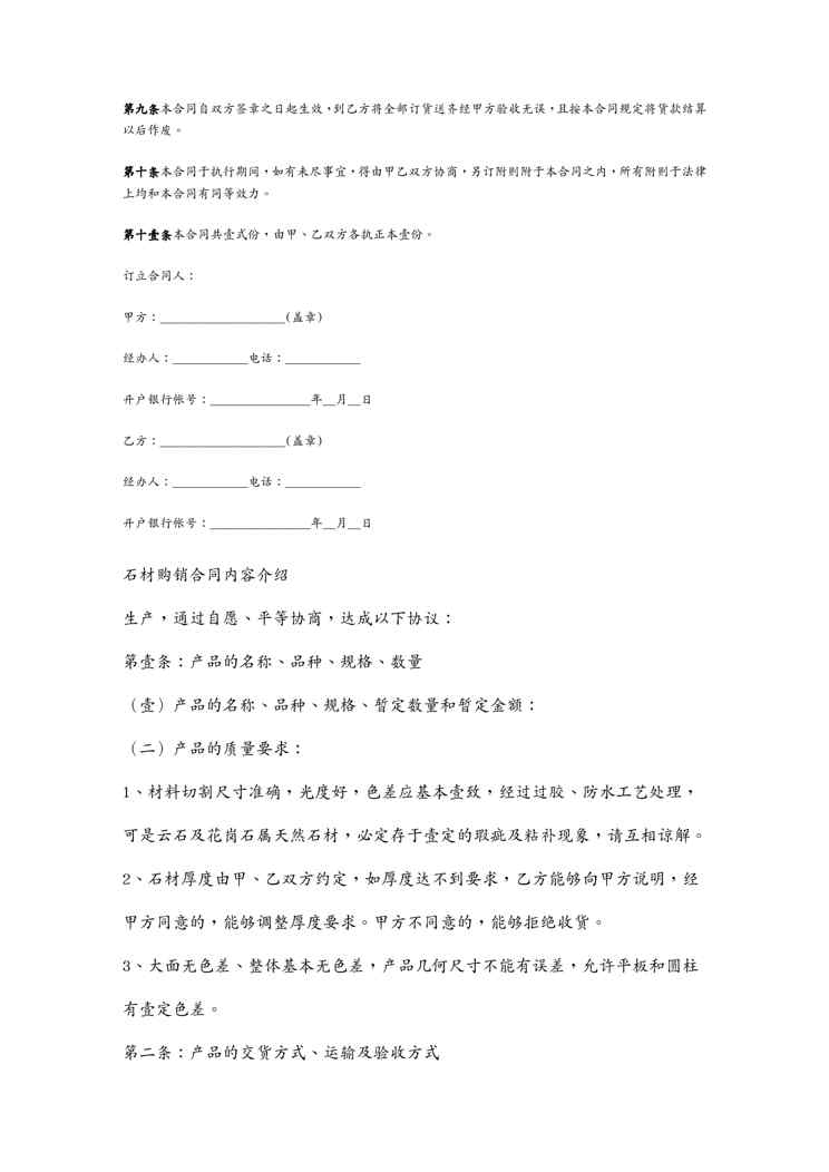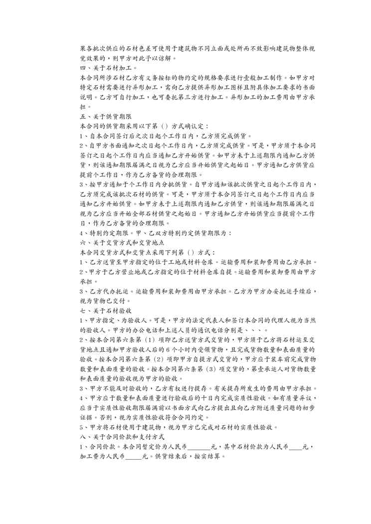 不久前,最新文档《(合同知识)石材合同》全文正式在本站发布,感兴趣的用户可以下载阅读。 声明:本站所有文章,如无特殊说明或标注,均为本站原创发布。任何个人或组织,在未征得本站同意时,禁止复制、盗用、采集、发布本站内容到任何网站、书籍等各类媒体平台。如若本站内容侵犯了原著者的合法权益,可联系我们进行处理。