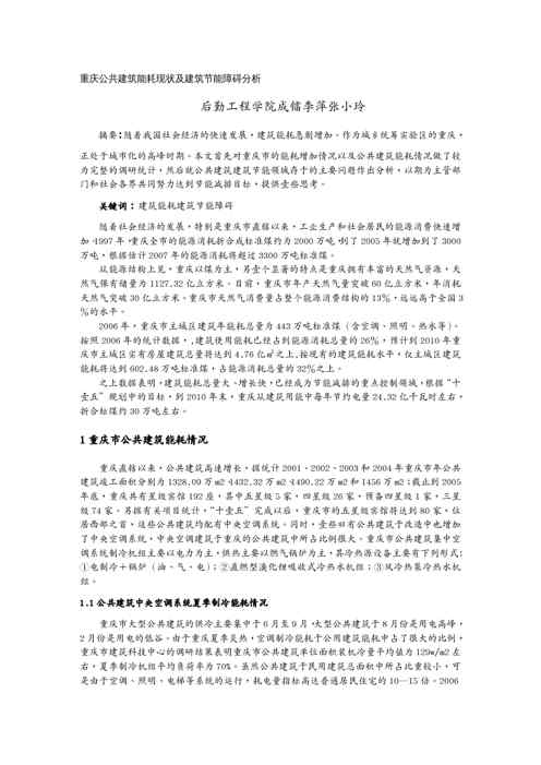 本站资深用户发布了最新的《(建筑工程管理)重庆公共建筑能耗状态及建筑节能障碍分析》文档,以下内容为预览,详细内容可下载阅读。 声明:本站所有文章,如无特殊说明或标注,均为本站原创发布。任何个人或组织,在未征得本站同意时,禁止复制、盗用、采集、发布本站内容到任何网站、书籍等各类媒体平台。如若本站内容侵犯了原著者的合法权益,可联系我们进行处理。