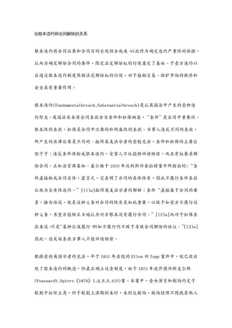 不久前,最新文档《(合同知识)论根本违约与合同解除的关系》全文正式在本站发布,感兴趣的用户可以下载阅读。 声明:本站所有文章,如无特殊说明或标注,均为本站原创发布。任何个人或组织,在未征得本站同意时,禁止复制、盗用、采集、发布本站内容到任何网站、书籍等各类媒体平台。如若本站内容侵犯了原著者的合法权益,可联系我们进行处理。