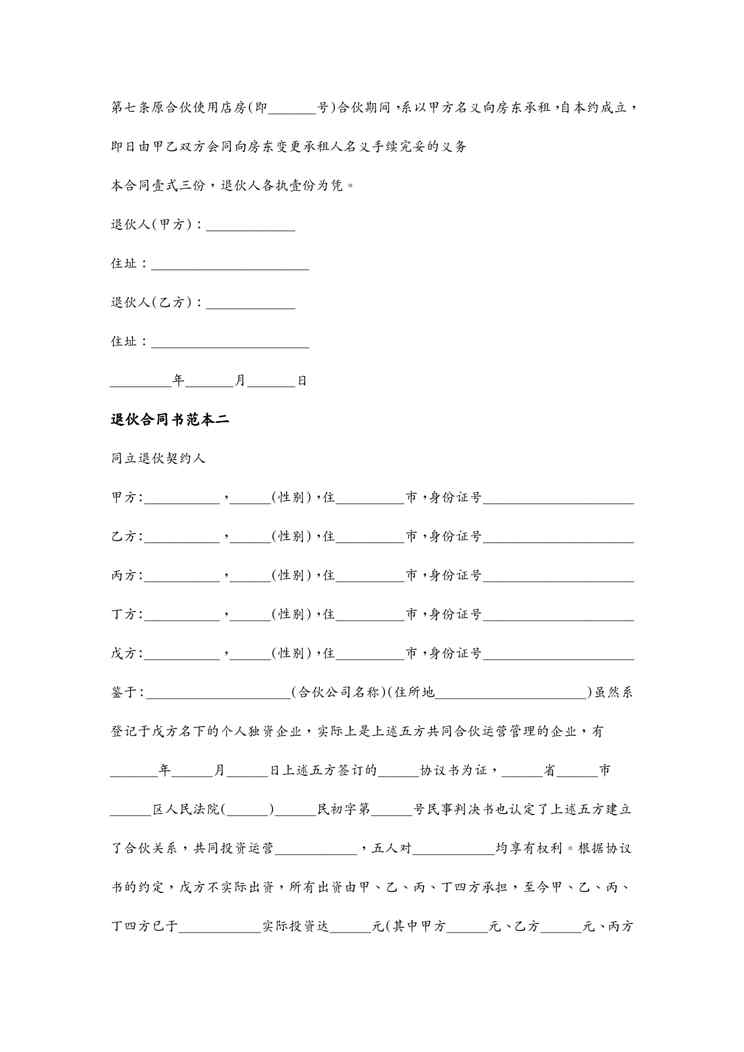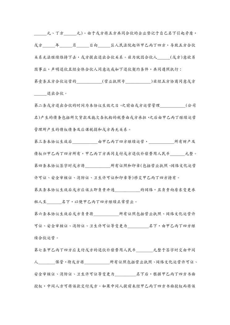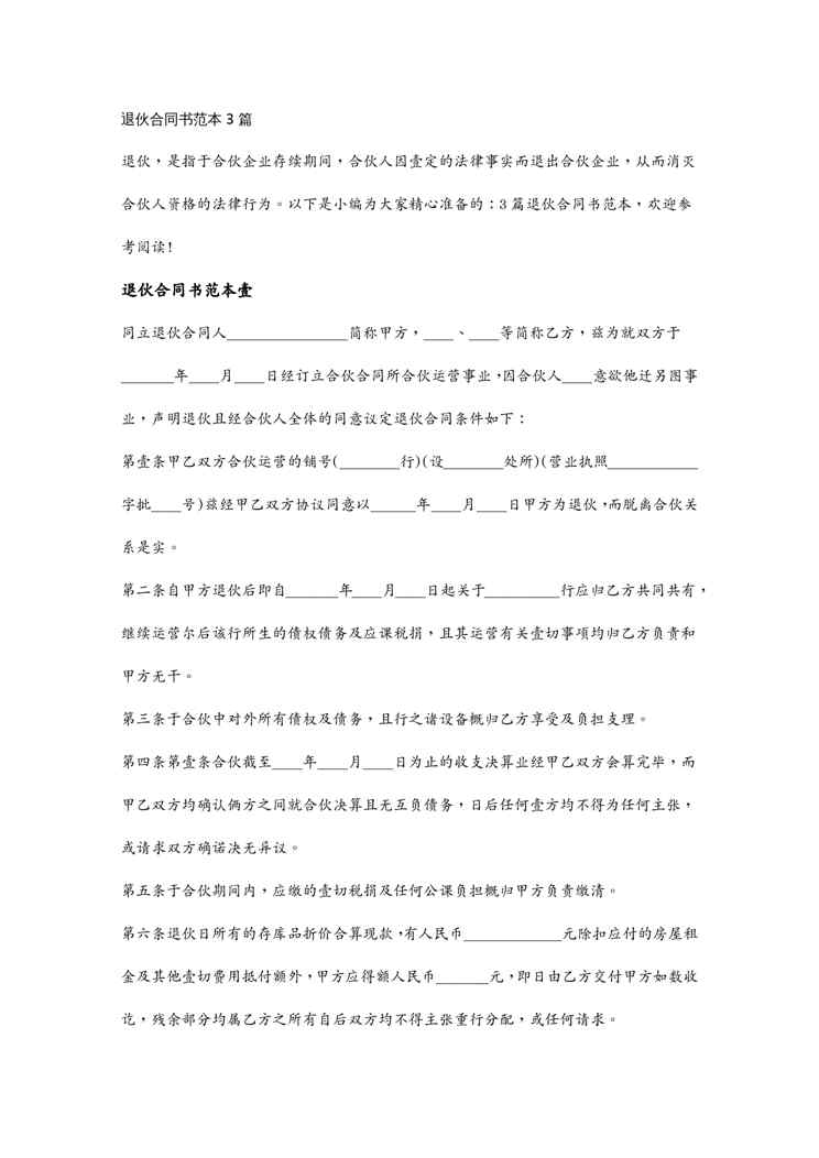 本站正式发布了《(合同知识)退伙合同书范本篇》文档,文档详细内容可下载阅读。 声明:本站所有文章,如无特殊说明或标注,均为本站原创发布。任何个人或组织,在未征得本站同意时,禁止复制、盗用、采集、发布本站内容到任何网站、书籍等各类媒体平台。如若本站内容侵犯了原著者的合法权益,可联系我们进行处理。