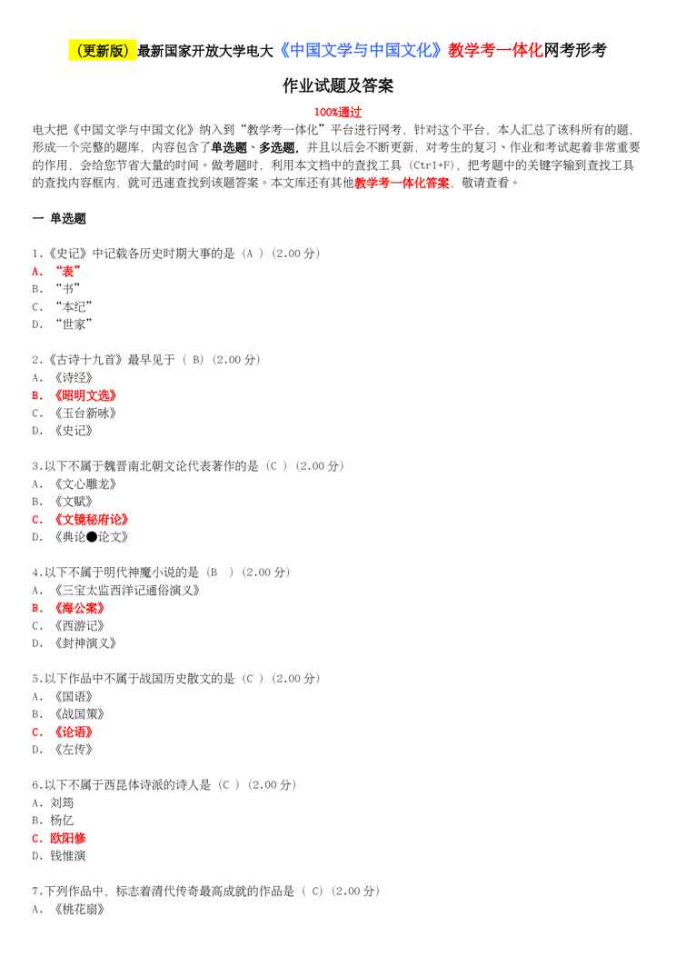 本站资深用户发布了最新的《(更新版)国家开放大学电大《中国文学与中国文化》教学考一体化网考形考作业》文档,以下内容为预览,详细内容可下载阅读。