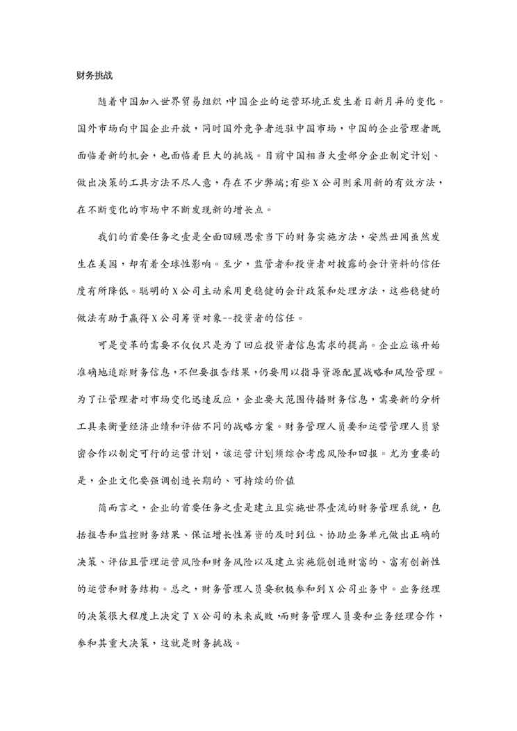 本站正式发布了《(财务知识)财务挑战》文档,文档详细内容可下载阅读。 声明:本站所有文章,如无特殊说明或标注,均为本站原创发布。任何个人或组织,在未征得本站同意时,禁止复制、盗用、采集、发布本站内容到任何网站、书籍等各类媒体平台。如若本站内容侵犯了原著者的合法权益,可联系我们进行处理。