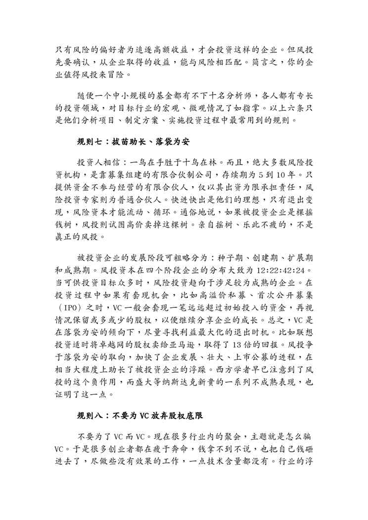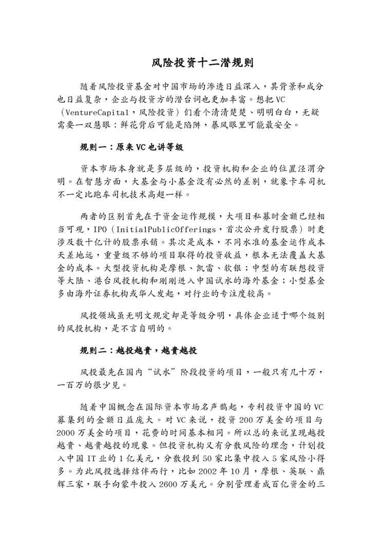 本站正式发布了《(风险管理)风险投资十二潜规则》文档,文档详细内容可下载阅读。 声明:本站所有文章,如无特殊说明或标注,均为本站原创发布。任何个人或组织,在未征得本站同意时,禁止复制、盗用、采集、发布本站内容到任何网站、书籍等各类媒体平台。如若本站内容侵犯了原著者的合法权益,可联系我们进行处理。