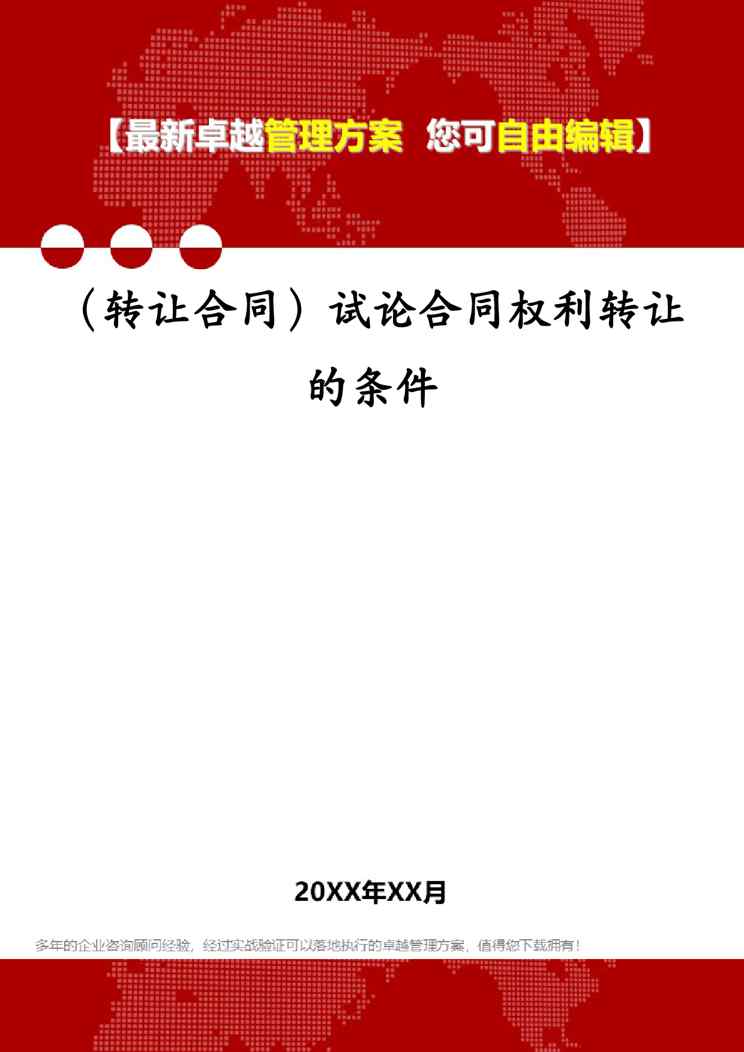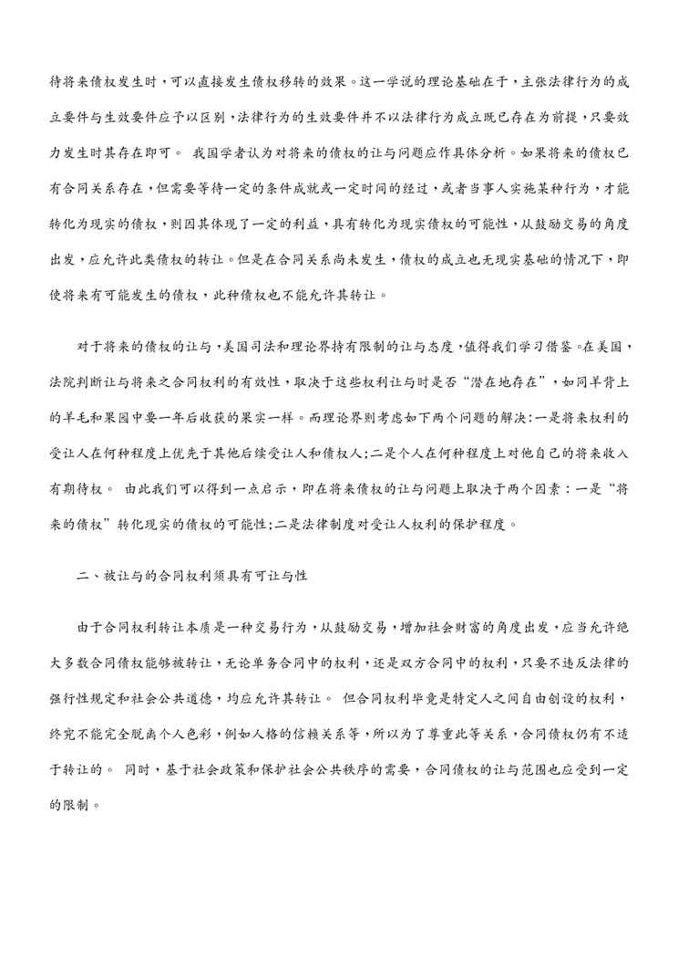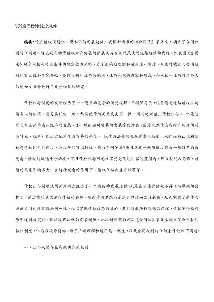 本站正式发布了《(转让合同)试论合同权利转让的条件》文档,文档详细内容可下载阅读。 声明:本站所有文章,如无特殊说明或标注,均为本站原创发布。任何个人或组织,在未征得本站同意时,禁止复制、盗用、采集、发布本站内容到任何网站、书籍等各类媒体平台。如若本站内容侵犯了原著者的合法权益,可联系我们进行处理。