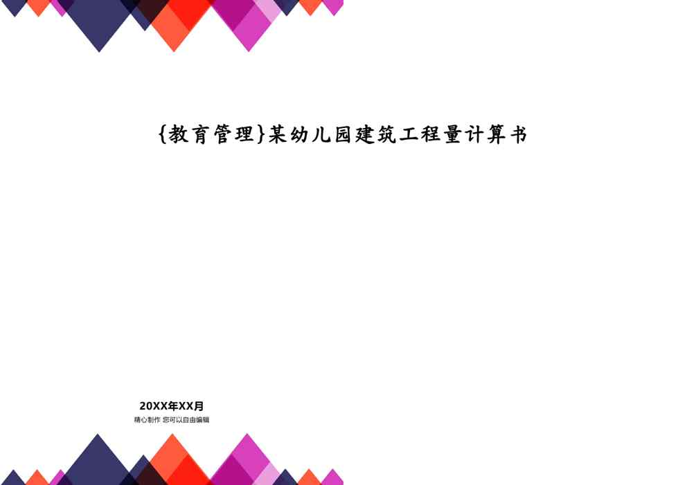 本站资深用户发布了最新的《{教育管理}某幼儿园建筑工程量计算书1609153811》文档,以下内容为预览,详细内容可下载阅读。 声明:本站所有文章,如无特殊说明或标注,均为本站原创发布。任何个人或组织,在未征得本站同意时,禁止复制、盗用、采集、发布本站内容到任何网站、书籍等各类媒体平台。如若本站内容侵犯了原著者的合法权益,可联系我们进行处理。