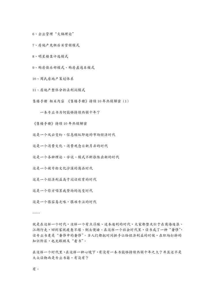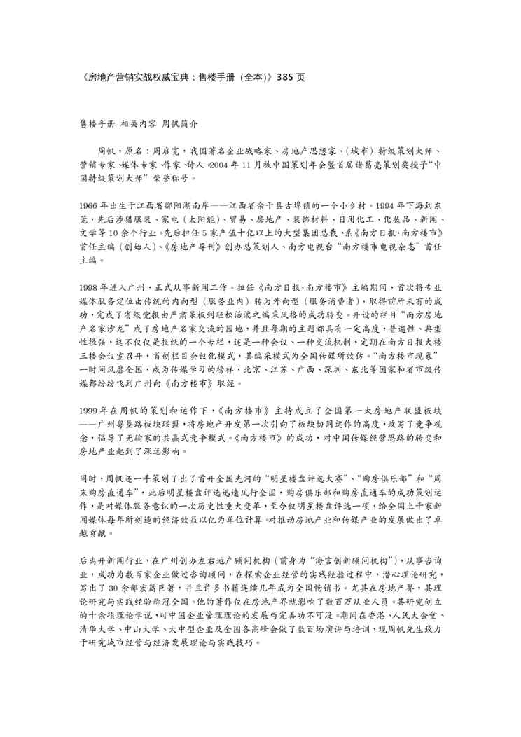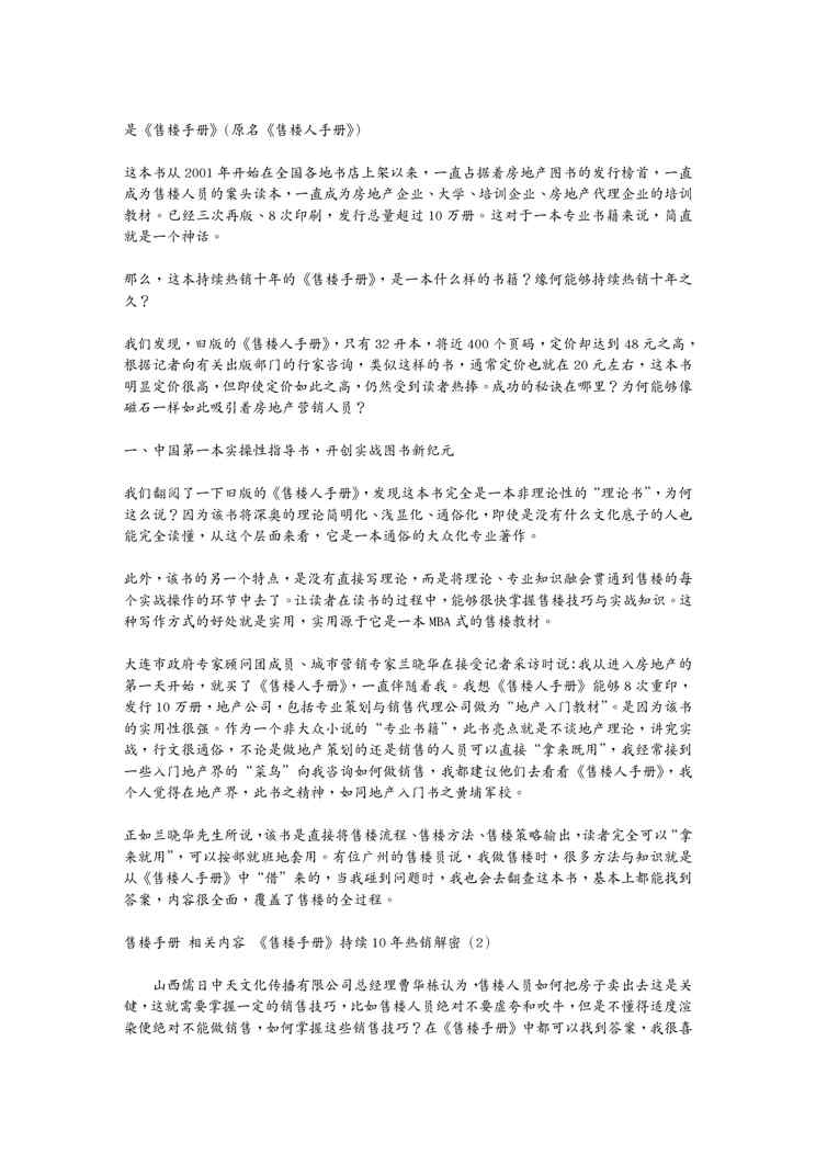 不久前,最新文档《(营销手册)房地产营销实战权威宝典售楼手册(全本)》全文正式在本站发布,感兴趣的用户可以下载阅读。 声明:本站所有文章,如无特殊说明或标注,均为本站原创发布。任何个人或组织,在未征得本站同意时,禁止复制、盗用、采集、发布本站内容到任何网站、书籍等各类媒体平台。如若本站内容侵犯了原著者的合法权益,可联系我们进行处理。