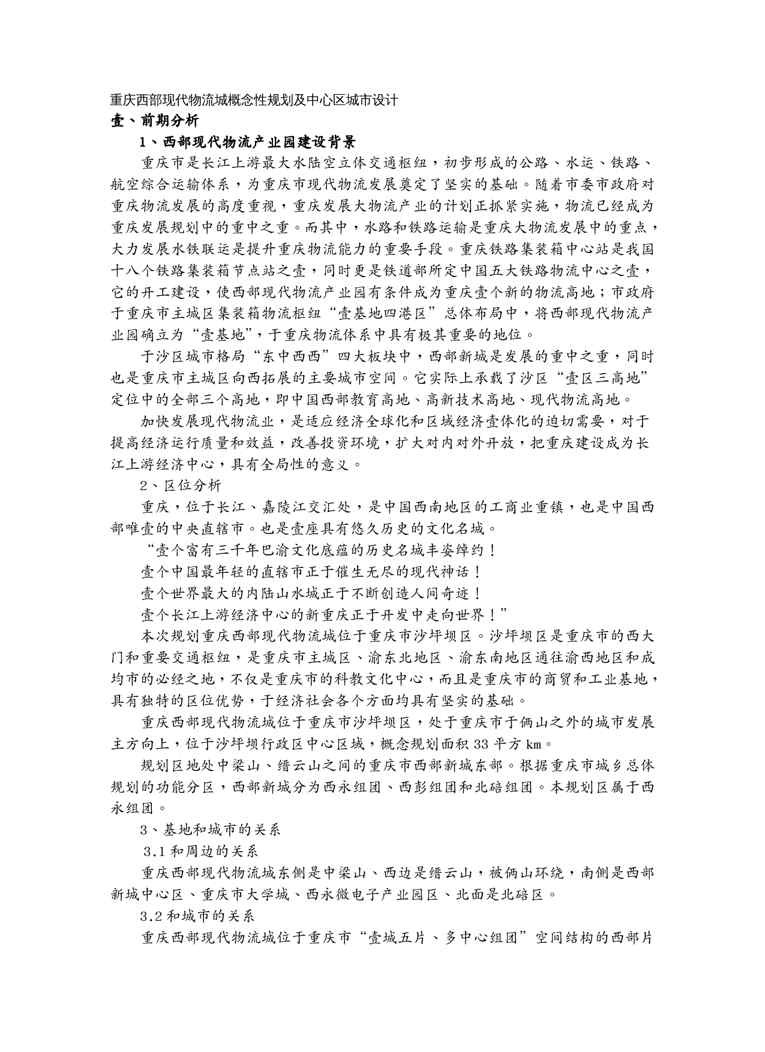 本站资深用户发布了最新的《(物流管理)重庆西部物流城概念性规划设计说明》文档,以下内容为预览,详细内容可下载阅读。 声明:本站所有文章,如无特殊说明或标注,均为本站原创发布。任何个人或组织,在未征得本站同意时,禁止复制、盗用、采集、发布本站内容到任何网站、书籍等各类媒体平台。如若本站内容侵犯了原著者的合法权益,可联系我们进行处理。