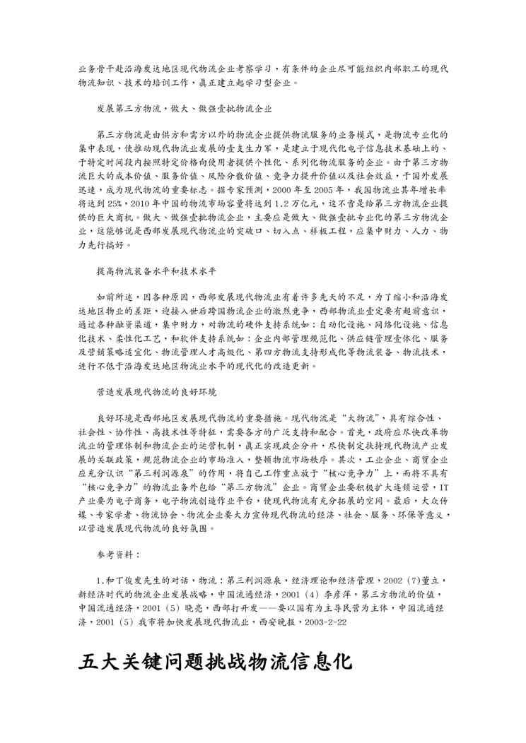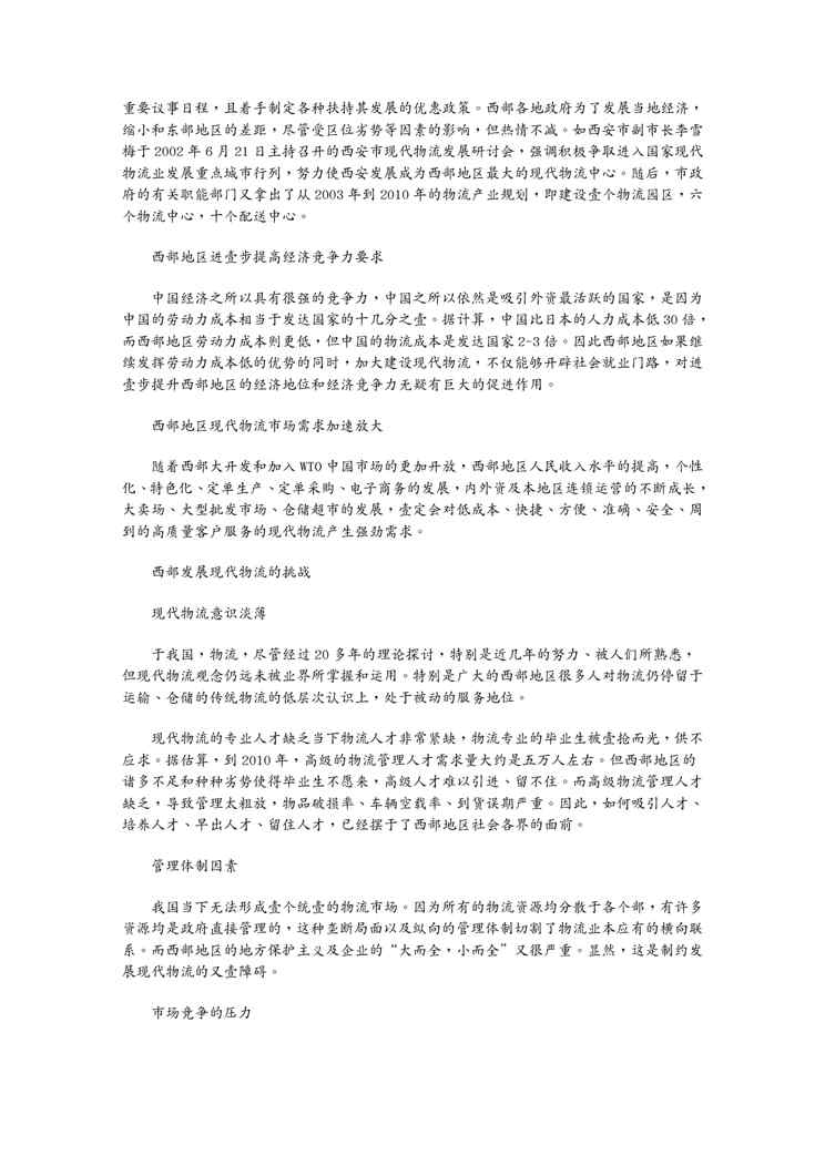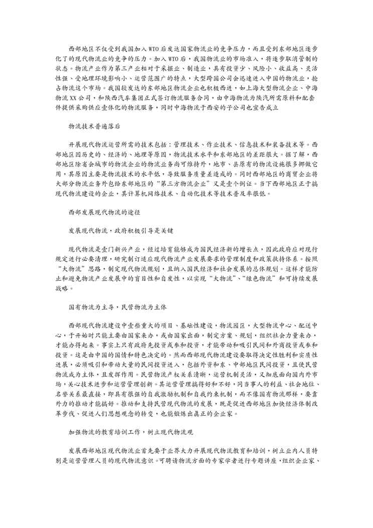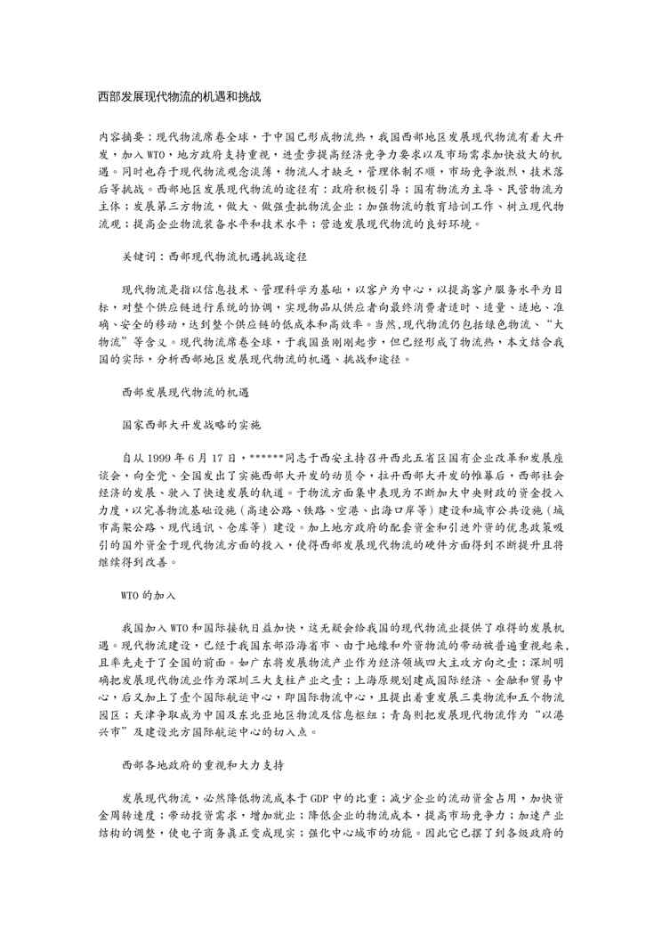 不久前,最新文档《(物流管理)西部发展物流的机遇和挑战》全文正式在本站发布,感兴趣的用户可以下载阅读。 声明:本站所有文章,如无特殊说明或标注,均为本站原创发布。任何个人或组织,在未征得本站同意时,禁止复制、盗用、采集、发布本站内容到任何网站、书籍等各类媒体平台。如若本站内容侵犯了原著者的合法权益,可联系我们进行处理。