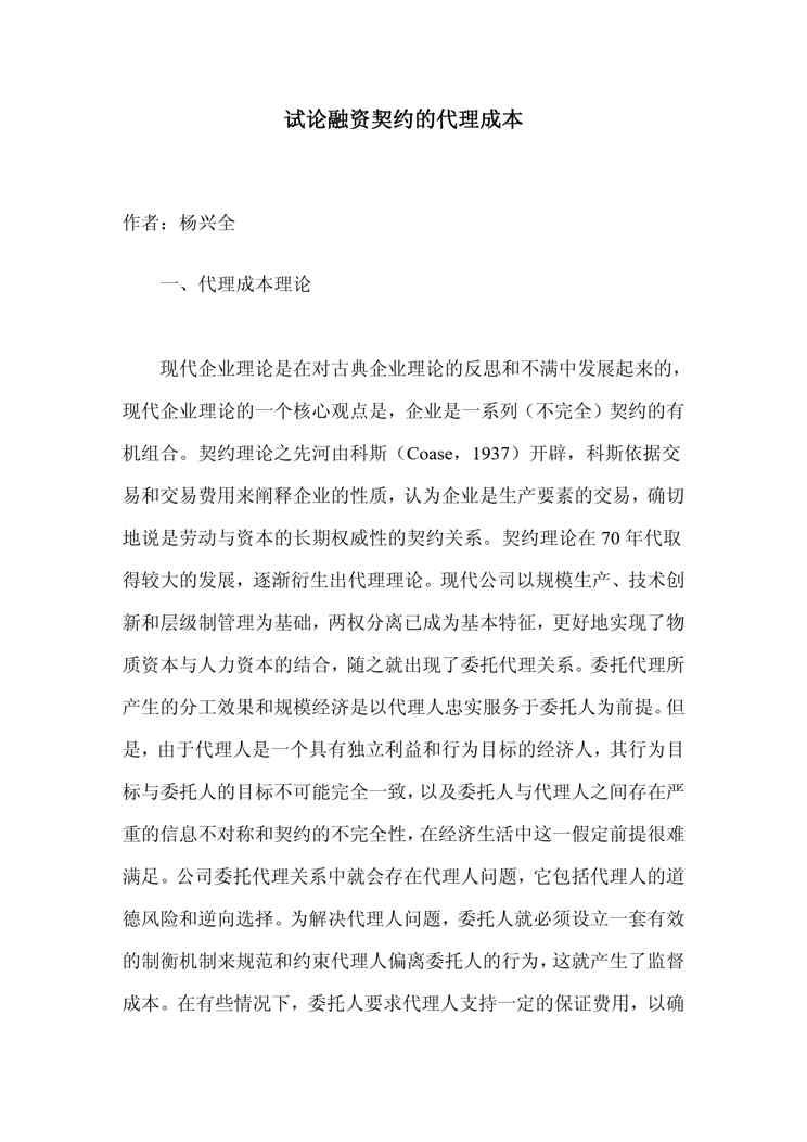 不久前,最新文档《试论融资契约的代理成本》全文正式在本站发布,感兴趣的用户可以下载阅读。 声明:本站所有文章,如无特殊说明或标注,均为本站原创发布。任何个人或组织,在未征得本站同意时,禁止复制、盗用、采集、发布本站内容到任何网站、书籍等各类媒体平台。如若本站内容侵犯了原著者的合法权益,可联系我们进行处理。