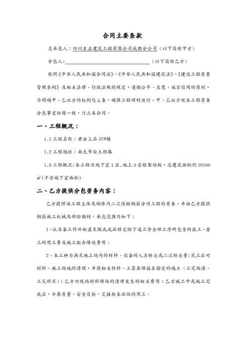 不久前,最新文档《(合同知识)GJ(会所钢筋工劳务合同)》全文正式在本站发布,感兴趣的用户可以下载阅读。 声明:本站所有文章,如无特殊说明或标注,均为本站原创发布。任何个人或组织,在未征得本站同意时,禁止复制、盗用、采集、发布本站内容到任何网站、书籍等各类媒体平台。如若本站内容侵犯了原著者的合法权益,可联系我们进行处理。