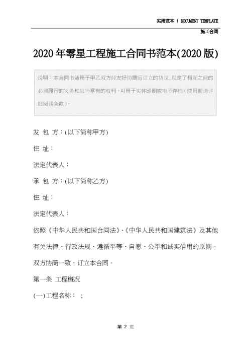 本站正式发布了《2020年零星工程施工合同书范本(2020版)》文档,文档详细内容可下载阅读。 声明:本站所有文章,如无特殊说明或标注,均为本站原创发布。任何个人或组织,在未征得本站同意时,禁止复制、盗用、采集、发布本站内容到任何网站、书籍等各类媒体平台。如若本站内容侵犯了原著者的合法权益,可联系我们进行处理。