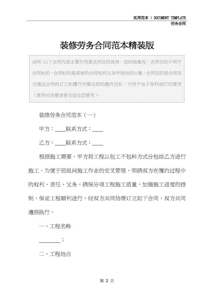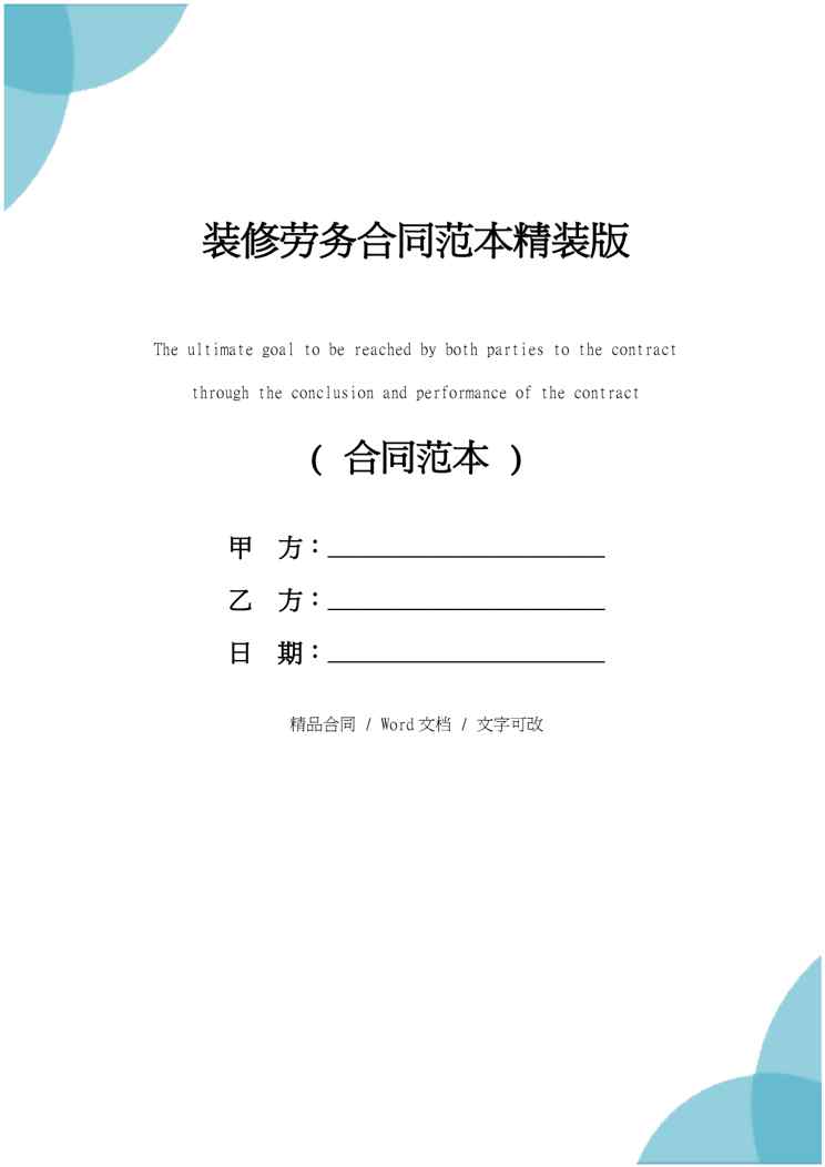 本站正式发布了《装修劳务合同范本精装版》文档,文档详细内容可下载阅读。 声明:本站所有文章,如无特殊说明或标注,均为本站原创发布。任何个人或组织,在未征得本站同意时,禁止复制、盗用、采集、发布本站内容到任何网站、书籍等各类媒体平台。如若本站内容侵犯了原著者的合法权益,可联系我们进行处理。