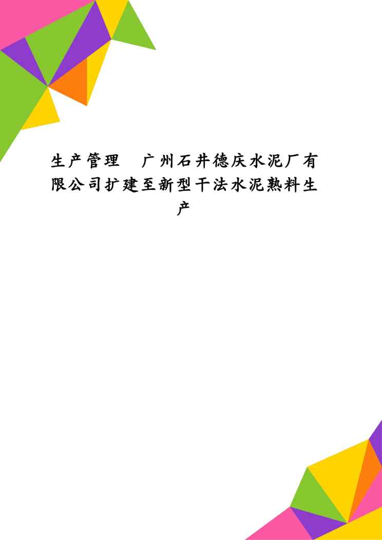不久前,最新文档《生产管理广州石井德庆水泥厂有限公司扩建至新型干法水泥熟料生产》全文正式在本站发布,感兴趣的用户可以下载阅读。 声明:本站所有文章,如无特殊说明或标注,均为本站原创发布。任何个人或组织,在未征得本站同意时,禁止复制、盗用、采集、发布本站内容到任何网站、书籍等各类媒体平台。如若本站内容侵犯了原著者的合法权益,可联系我们进行处理。