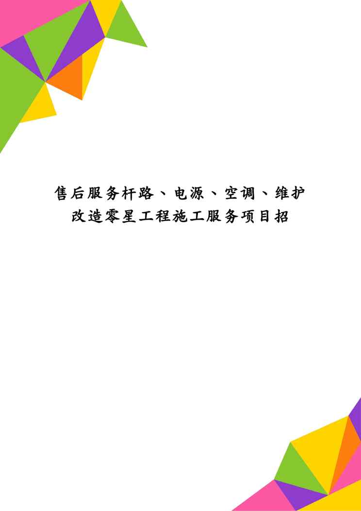 本站正式发布了《售后服务杆路、电源、空调、维护改造零星工程施工服务项目招》文档,文档详细内容可下载阅读。 声明:本站所有文章,如无特殊说明或标注,均为本站原创发布。任何个人或组织,在未征得本站同意时,禁止复制、盗用、采集、发布本站内容到任何网站、书籍等各类媒体平台。如若本站内容侵犯了原著者的合法权益,可联系我们进行处理。