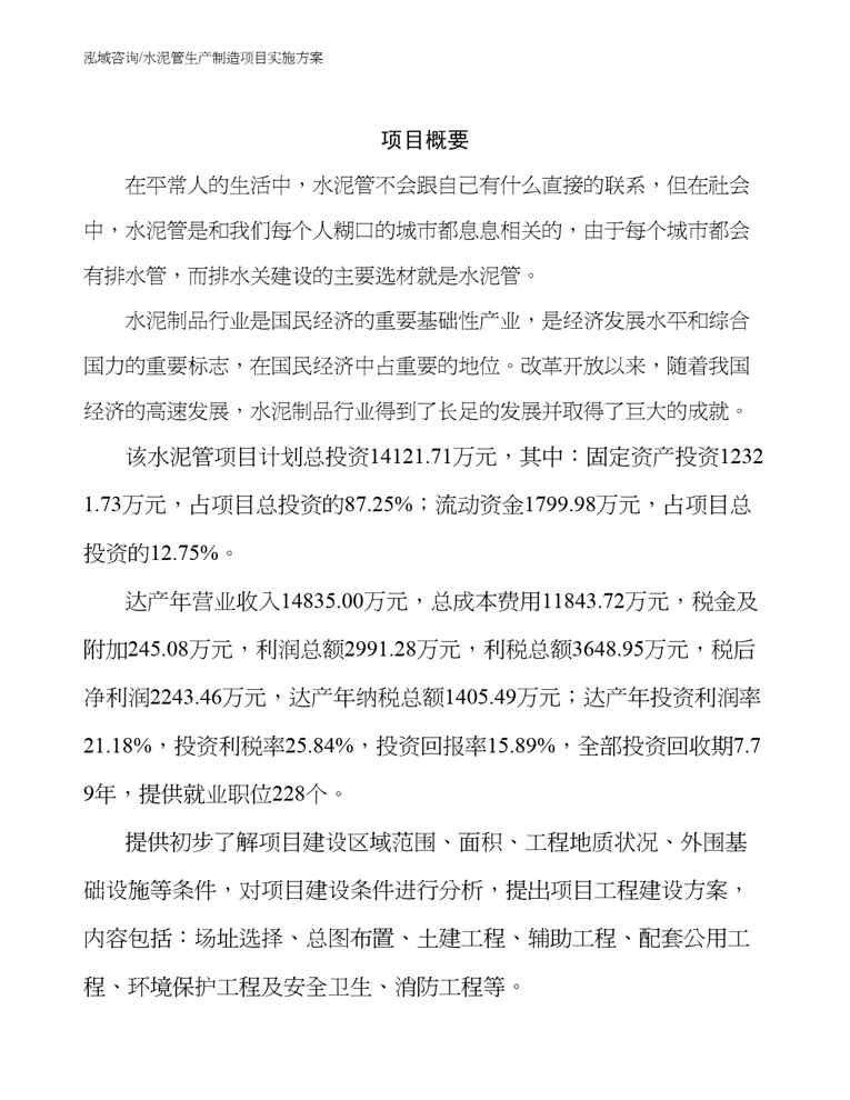 本站资深用户发布了最新的《水泥管生产制造项目实施方案参考模板》文档,以下内容为预览,详细内容可下载阅读。 声明:本站所有文章,如无特殊说明或标注,均为本站原创发布。任何个人或组织,在未征得本站同意时,禁止复制、盗用、采集、发布本站内容到任何网站、书籍等各类媒体平台。如若本站内容侵犯了原著者的合法权益,可联系我们进行处理。