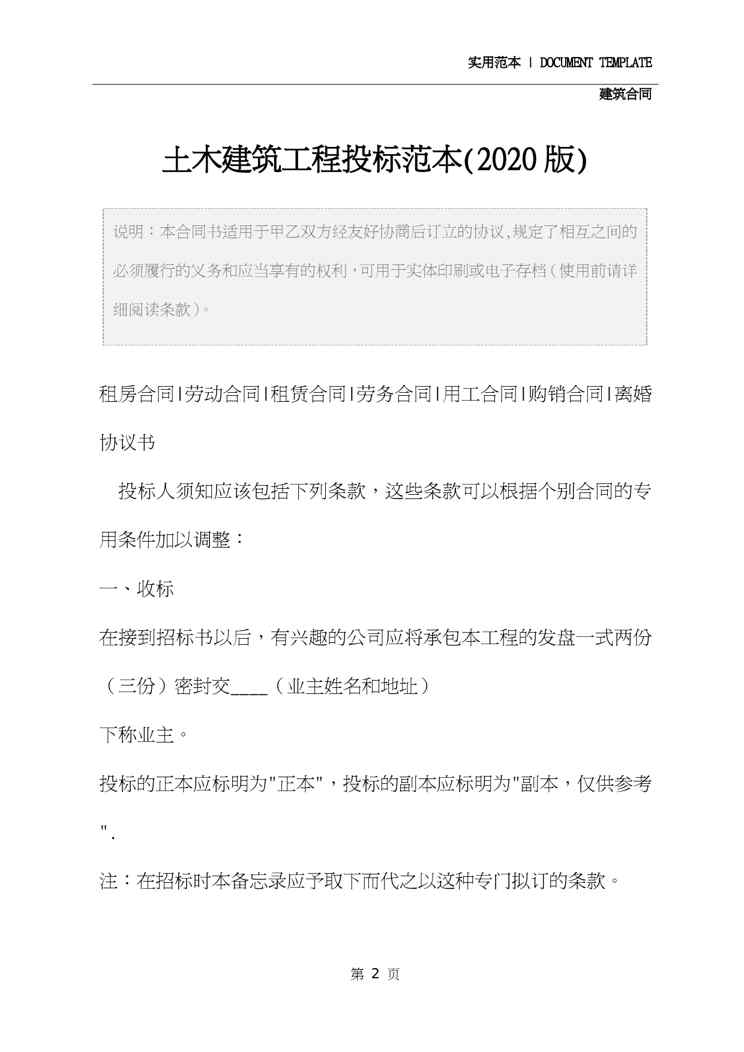 本站正式发布了《土木建筑工程投标范本(2020版)》文档,文档详细内容可下载阅读。 声明:本站所有文章,如无特殊说明或标注,均为本站原创发布。任何个人或组织,在未征得本站同意时,禁止复制、盗用、采集、发布本站内容到任何网站、书籍等各类媒体平台。如若本站内容侵犯了原著者的合法权益,可联系我们进行处理。