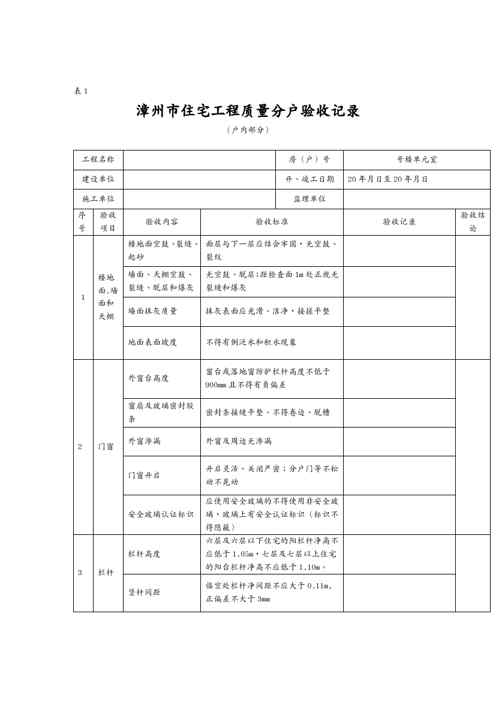 不久前,最新文档《{品质管理制度表格}漳州市住宅工程质量分户验收记录表》全文正式在本站发布,感兴趣的用户可以下载阅读。 声明:本站所有文章,如无特殊说明或标注,均为本站原创发布。任何个人或组织,在未征得本站同意时,禁止复制、盗用、采集、发布本站内容到任何网站、书籍等各类媒体平台。如若本站内容侵犯了原著者的合法权益,可联系我们进行处理。