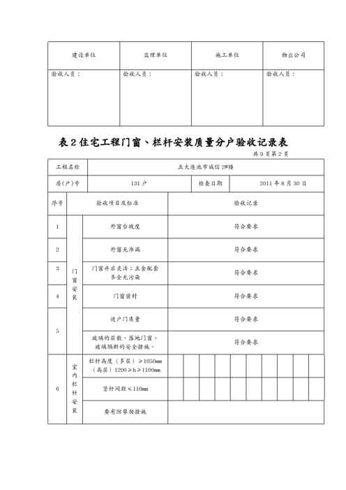 本站正式发布了《{品质管理制度表格}住宅工程门窗栏杆安装质量分户验收记录表表》文档,文档详细内容可下载阅读。 声明:本站所有文章,如无特殊说明或标注,均为本站原创发布。任何个人或组织,在未征得本站同意时,禁止复制、盗用、采集、发布本站内容到任何网站、书籍等各类媒体平台。如若本站内容侵犯了原著者的合法权益,可联系我们进行处理。