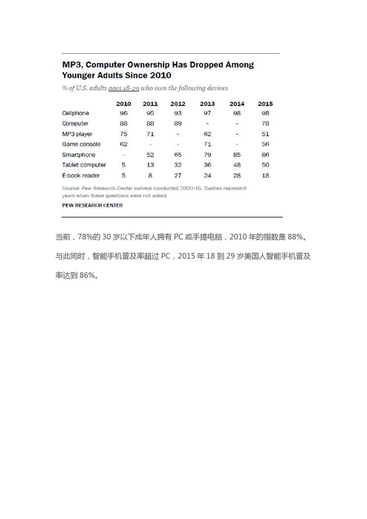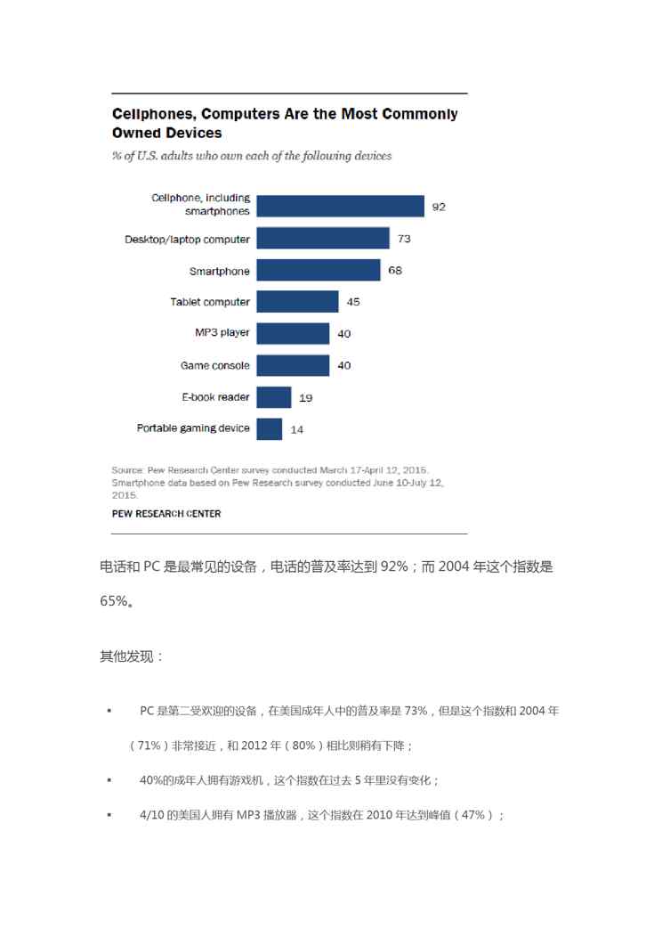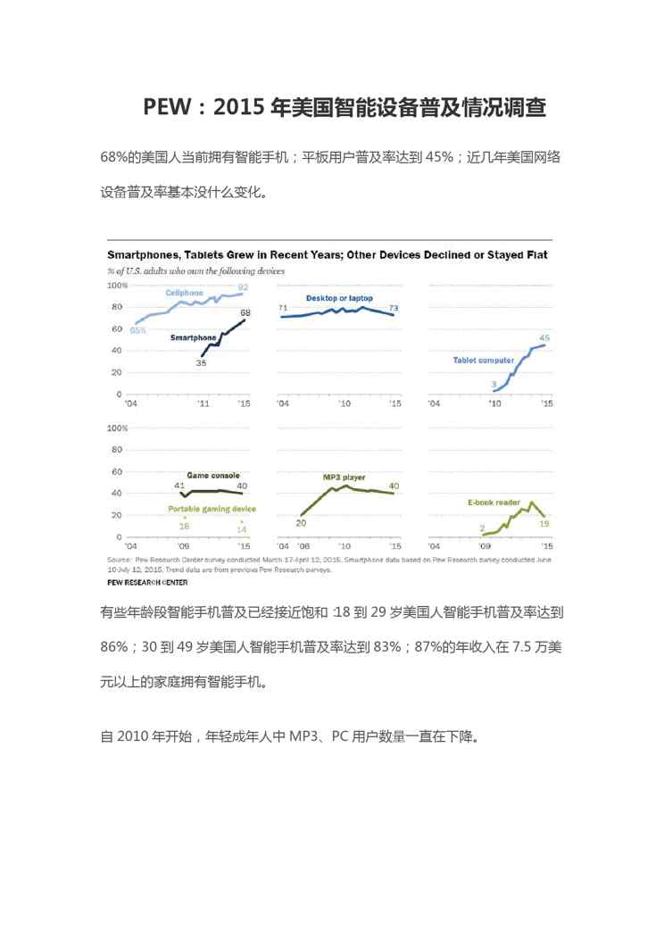 本站正式发布了《PEW:2015年美国智能设备普及情况调查》文档,文档详细内容可下载阅读。 声明:本站所有文章,如无特殊说明或标注,均为本站原创发布。任何个人或组织,在未征得本站同意时,禁止复制、盗用、采集、发布本站内容到任何网站、书籍等各类媒体平台。如若本站内容侵犯了原著者的合法权益,可联系我们进行处理。