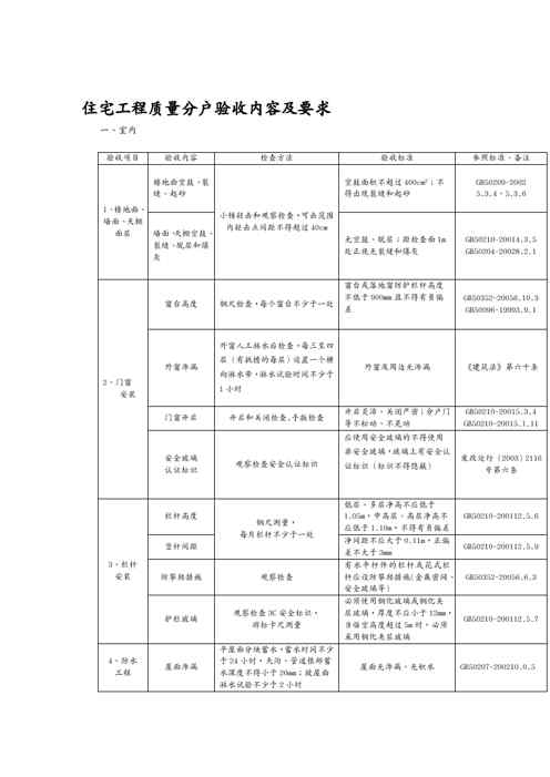 本站资深用户发布了最新的《{品质管理制度表格}住宅建筑工程质量验收表》文档,以下内容为预览,详细内容可下载阅读。 声明:本站所有文章,如无特殊说明或标注,均为本站原创发布。任何个人或组织,在未征得本站同意时,禁止复制、盗用、采集、发布本站内容到任何网站、书籍等各类媒体平台。如若本站内容侵犯了原著者的合法权益,可联系我们进行处理。