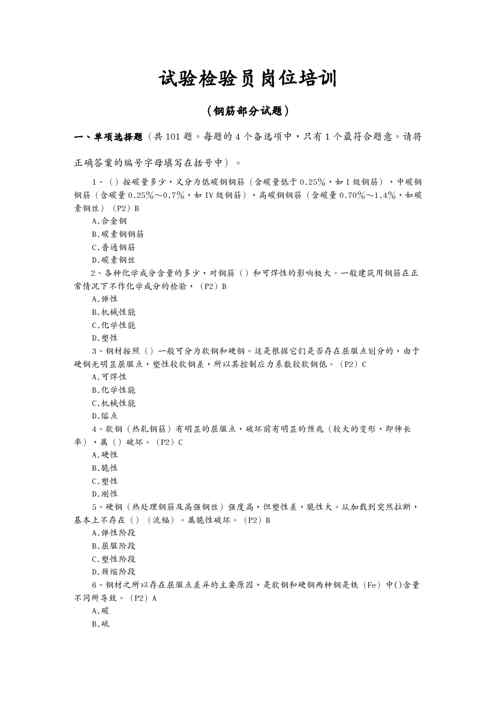 不久前,最新文档《{品质管理质量检验员}试验检验员培训钢筋题目综合共题》全文正式在本站发布,感兴趣的用户可以下载阅读。 声明:本站所有文章,如无特殊说明或标注,均为本站原创发布。任何个人或组织,在未征得本站同意时,禁止复制、盗用、采集、发布本站内容到任何网站、书籍等各类媒体平台。如若本站内容侵犯了原著者的合法权益,可联系我们进行处理。