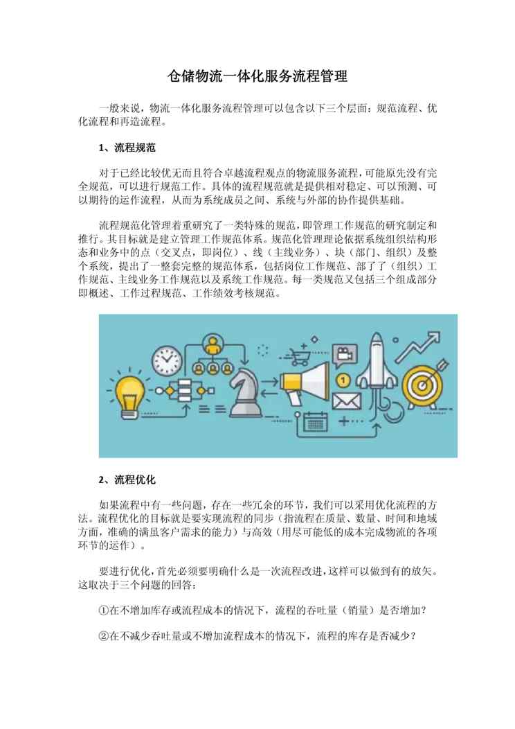 不久前,最新文档《仓储物流一体化服务流程管理》全文正式在本站发布,感兴趣的用户可以下载阅读。 声明:本站所有文章,如无特殊说明或标注,均为本站原创发布。任何个人或组织,在未征得本站同意时,禁止复制、盗用、采集、发布本站内容到任何网站、书籍等各类媒体平台。如若本站内容侵犯了原著者的合法权益,可联系我们进行处理。