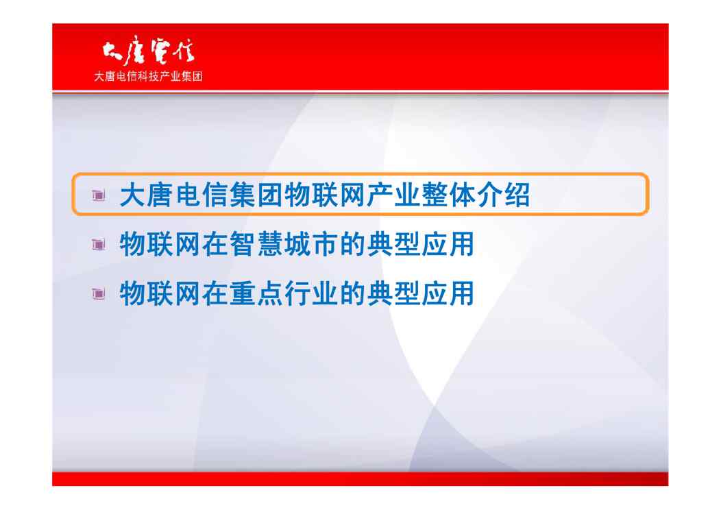 本站资深用户发布了最新的《大唐电信集团物联网整体解决方案介绍》文档,以下内容为预览,详细内容可下载阅读。 声明:本站所有文章,如无特殊说明或标注,均为本站原创发布。任何个人或组织,在未征得本站同意时,禁止复制、盗用、采集、发布本站内容到任何网站、书籍等各类媒体平台。如若本站内容侵犯了原著者的合法权益,可联系我们进行处理。