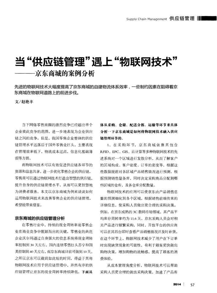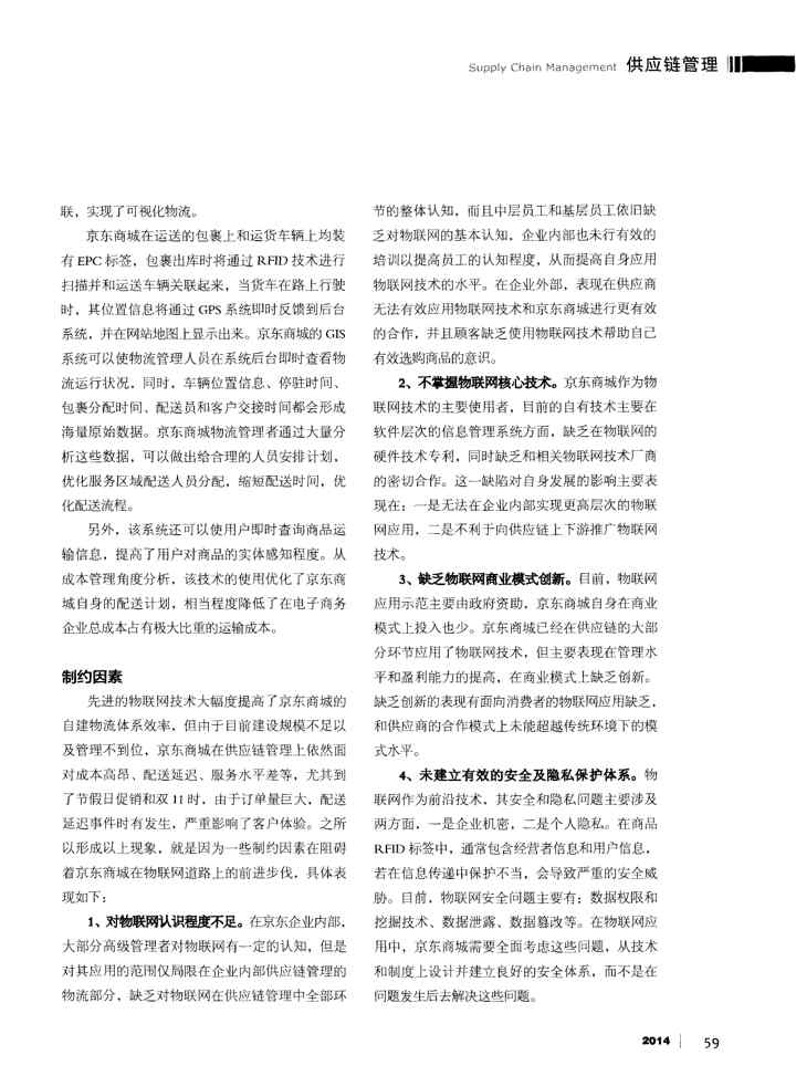 本站资深用户发布了最新的《当“供应链管理”遇上“物联网技术”——京东商城的案例分析》文档,以下内容为预览,详细内容可下载阅读。 声明:本站所有文章,如无特殊说明或标注,均为本站原创发布。任何个人或组织,在未征得本站同意时,禁止复制、盗用、采集、发布本站内容到任何网站、书籍等各类媒体平台。如若本站内容侵犯了原著者的合法权益,可联系我们进行处理。