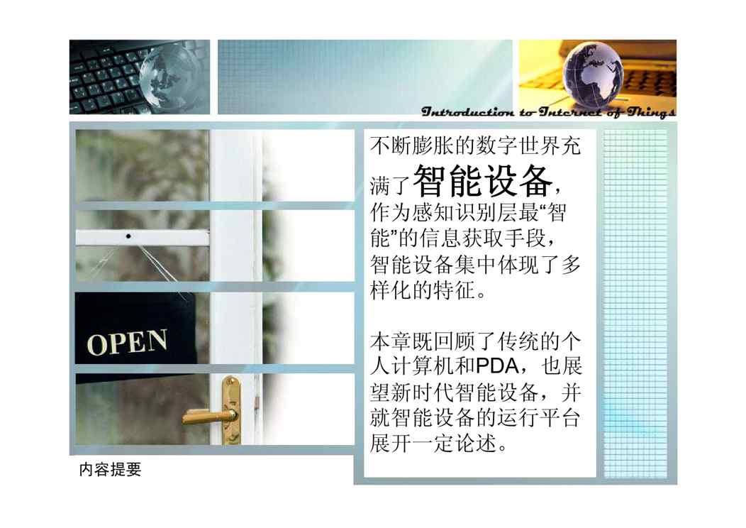 本站资深用户发布了最新的《第5章 智能信息设备》文档,以下内容为预览,详细内容可下载阅读。 声明:本站所有文章,如无特殊说明或标注,均为本站原创发布。任何个人或组织,在未征得本站同意时,禁止复制、盗用、采集、发布本站内容到任何网站、书籍等各类媒体平台。如若本站内容侵犯了原著者的合法权益,可联系我们进行处理。
