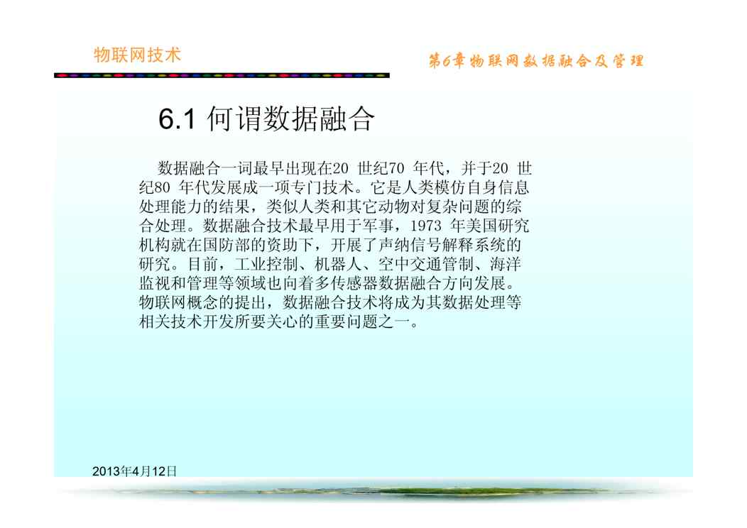 不久前,最新文档《第6章_物联网数据融合及管理》全文正式在本站发布,感兴趣的用户可以下载阅读。 声明:本站所有文章,如无特殊说明或标注,均为本站原创发布。任何个人或组织,在未征得本站同意时,禁止复制、盗用、采集、发布本站内容到任何网站、书籍等各类媒体平台。如若本站内容侵犯了原著者的合法权益,可联系我们进行处理。