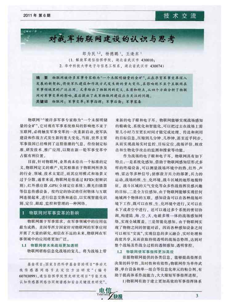 本站正式发布了《对我军物联网建设的认识与思考》文档,文档详细内容可下载阅读。 声明:本站所有文章,如无特殊说明或标注,均为本站原创发布。任何个人或组织,在未征得本站同意时,禁止复制、盗用、采集、发布本站内容到任何网站、书籍等各类媒体平台。如若本站内容侵犯了原著者的合法权益,可联系我们进行处理。