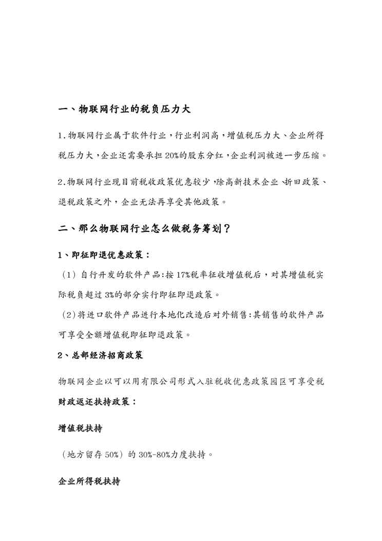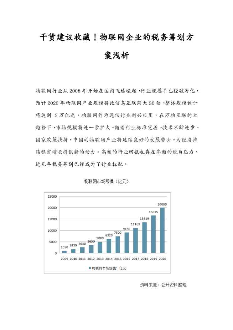 不久前,最新文档《干货建议收藏!物联网企业的税务筹划方案浅析》全文正式在本站发布,感兴趣的用户可以下载阅读。 声明:本站所有文章,如无特殊说明或标注,均为本站原创发布。任何个人或组织,在未征得本站同意时,禁止复制、盗用、采集、发布本站内容到任何网站、书籍等各类媒体平台。如若本站内容侵犯了原著者的合法权益,可联系我们进行处理。