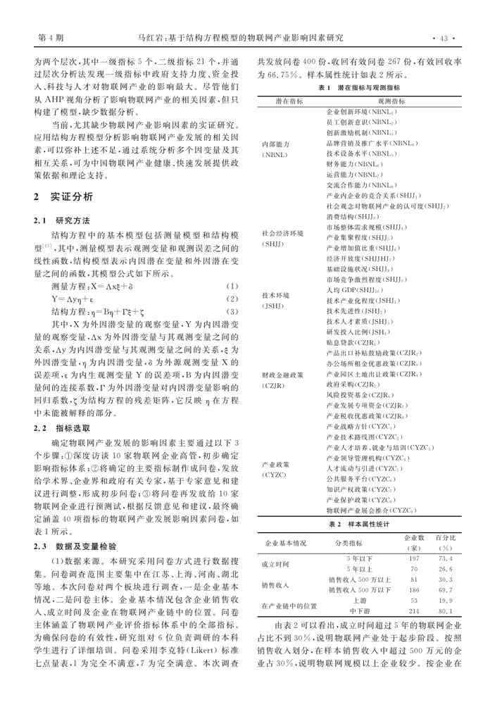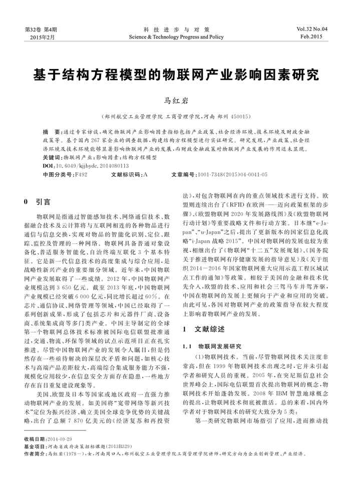 本站资深用户发布了最新的《基于结构方程模型的物联网产业影响因素研究》文档,以下内容为预览,详细内容可下载阅读。 声明:本站所有文章,如无特殊说明或标注,均为本站原创发布。任何个人或组织,在未征得本站同意时,禁止复制、盗用、采集、发布本站内容到任何网站、书籍等各类媒体平台。如若本站内容侵犯了原著者的合法权益,可联系我们进行处理。