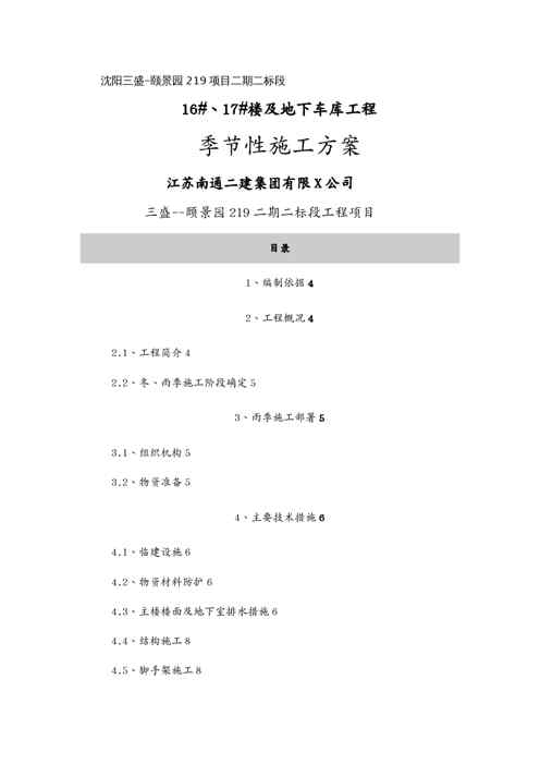 本站资深用户发布了最新的《(建筑工程管理)季节性施工方案》文档,以下内容为预览,详细内容可下载阅读。 声明:本站所有文章,如无特殊说明或标注,均为本站原创发布。任何个人或组织,在未征得本站同意时,禁止复制、盗用、采集、发布本站内容到任何网站、书籍等各类媒体平台。如若本站内容侵犯了原著者的合法权益,可联系我们进行处理。