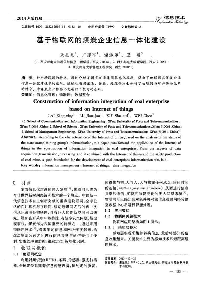 本站正式发布了《基于物联网的煤炭企业信息一体化建设》文档,文档详细内容可下载阅读。 声明:本站所有文章,如无特殊说明或标注,均为本站原创发布。任何个人或组织,在未征得本站同意时,禁止复制、盗用、采集、发布本站内容到任何网站、书籍等各类媒体平台。如若本站内容侵犯了原著者的合法权益,可联系我们进行处理。