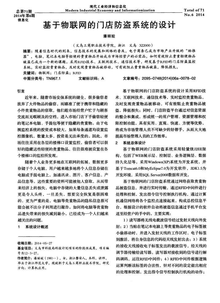 不久前,最新文档《基于物联网的门店防盗系统的设计》全文正式在本站发布,感兴趣的用户可以下载阅读。 声明:本站所有文章,如无特殊说明或标注,均为本站原创发布。任何个人或组织,在未征得本站同意时,禁止复制、盗用、采集、发布本站内容到任何网站、书籍等各类媒体平台。如若本站内容侵犯了原著者的合法权益,可联系我们进行处理。