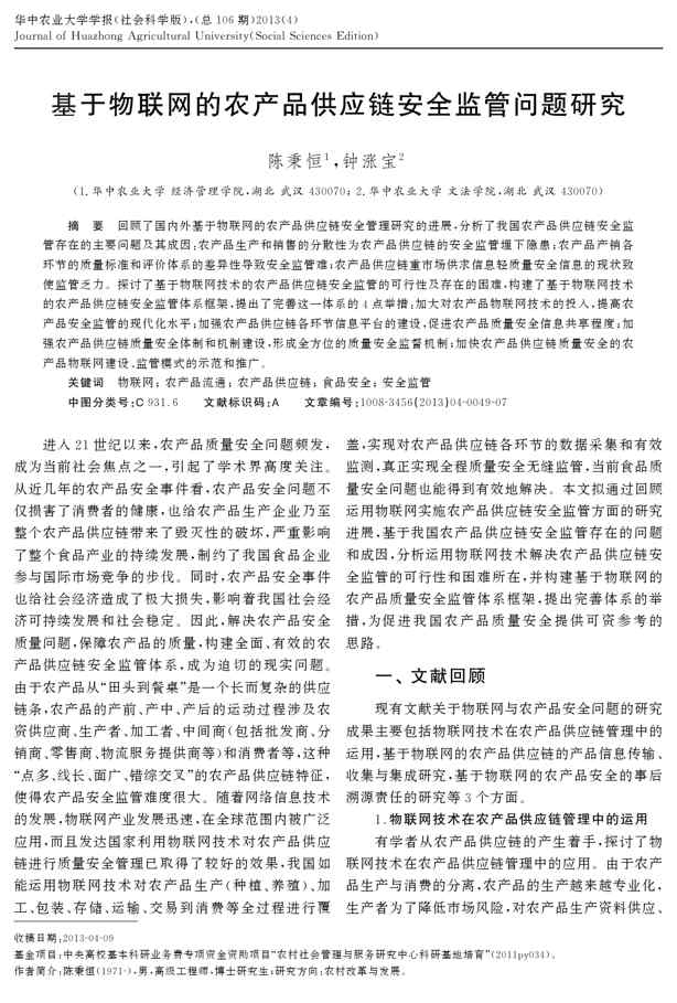不久前,最新文档《基于物联网的农产品供应链安全监管问题研究》全文正式在本站发布,感兴趣的用户可以下载阅读。 声明:本站所有文章,如无特殊说明或标注,均为本站原创发布。任何个人或组织,在未征得本站同意时,禁止复制、盗用、采集、发布本站内容到任何网站、书籍等各类媒体平台。如若本站内容侵犯了原著者的合法权益,可联系我们进行处理。