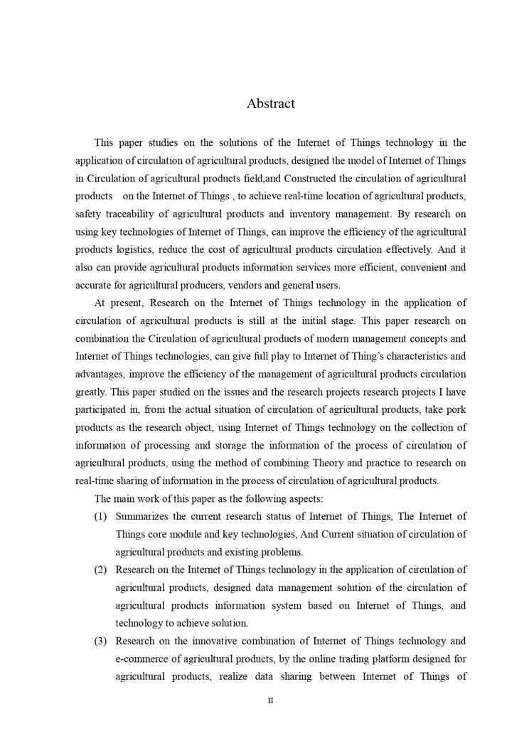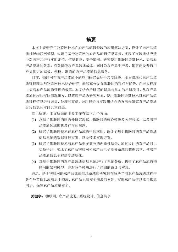 不久前,最新文档《基于物联网的农产品流通信息系统研究与设计》全文正式在本站发布,感兴趣的用户可以下载阅读。 声明:本站所有文章,如无特殊说明或标注,均为本站原创发布。任何个人或组织,在未征得本站同意时,禁止复制、盗用、采集、发布本站内容到任何网站、书籍等各类媒体平台。如若本站内容侵犯了原著者的合法权益,可联系我们进行处理。