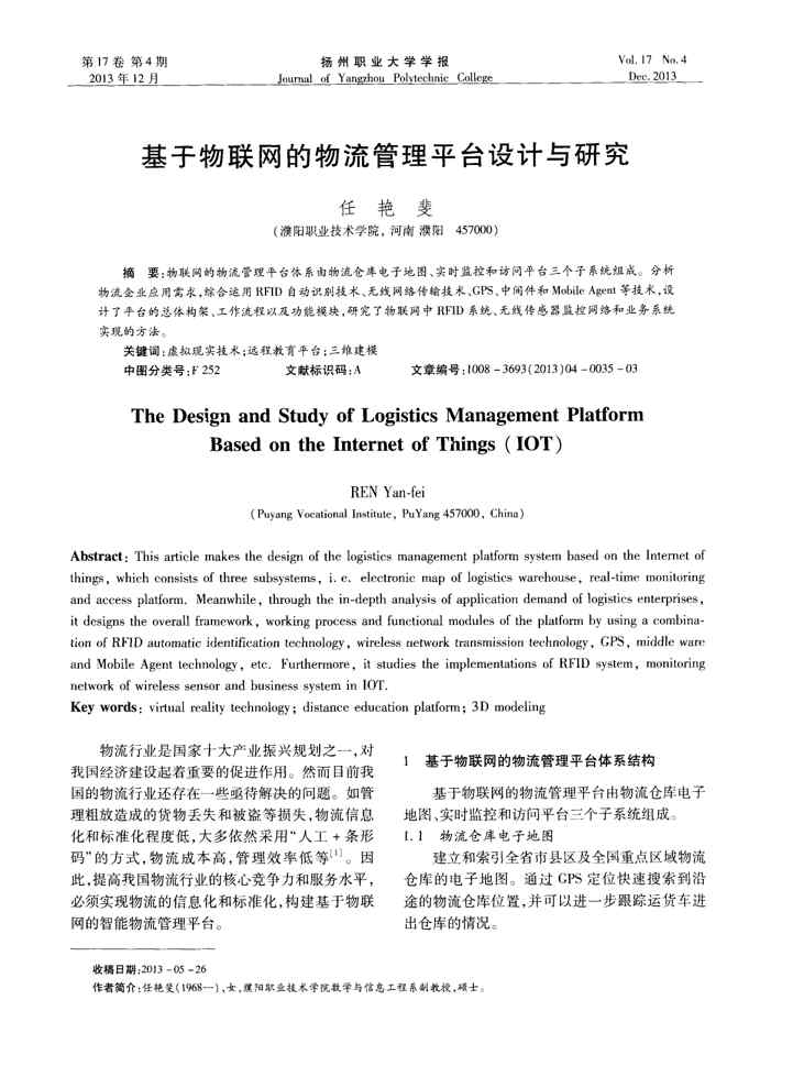 不久前,最新文档《基于物联网的物流管理平台设计与研究》全文正式在本站发布,感兴趣的用户可以下载阅读。 声明:本站所有文章,如无特殊说明或标注,均为本站原创发布。任何个人或组织,在未征得本站同意时,禁止复制、盗用、采集、发布本站内容到任何网站、书籍等各类媒体平台。如若本站内容侵犯了原著者的合法权益,可联系我们进行处理。