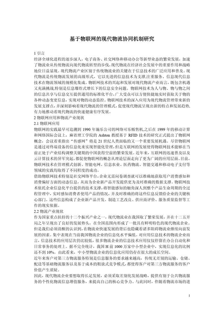 本站资深用户发布了最新的《基于物联网的现代物流协同机制研究》文档,以下内容为预览,详细内容可下载阅读。 声明:本站所有文章,如无特殊说明或标注,均为本站原创发布。任何个人或组织,在未征得本站同意时,禁止复制、盗用、采集、发布本站内容到任何网站、书籍等各类媒体平台。如若本站内容侵犯了原著者的合法权益,可联系我们进行处理。